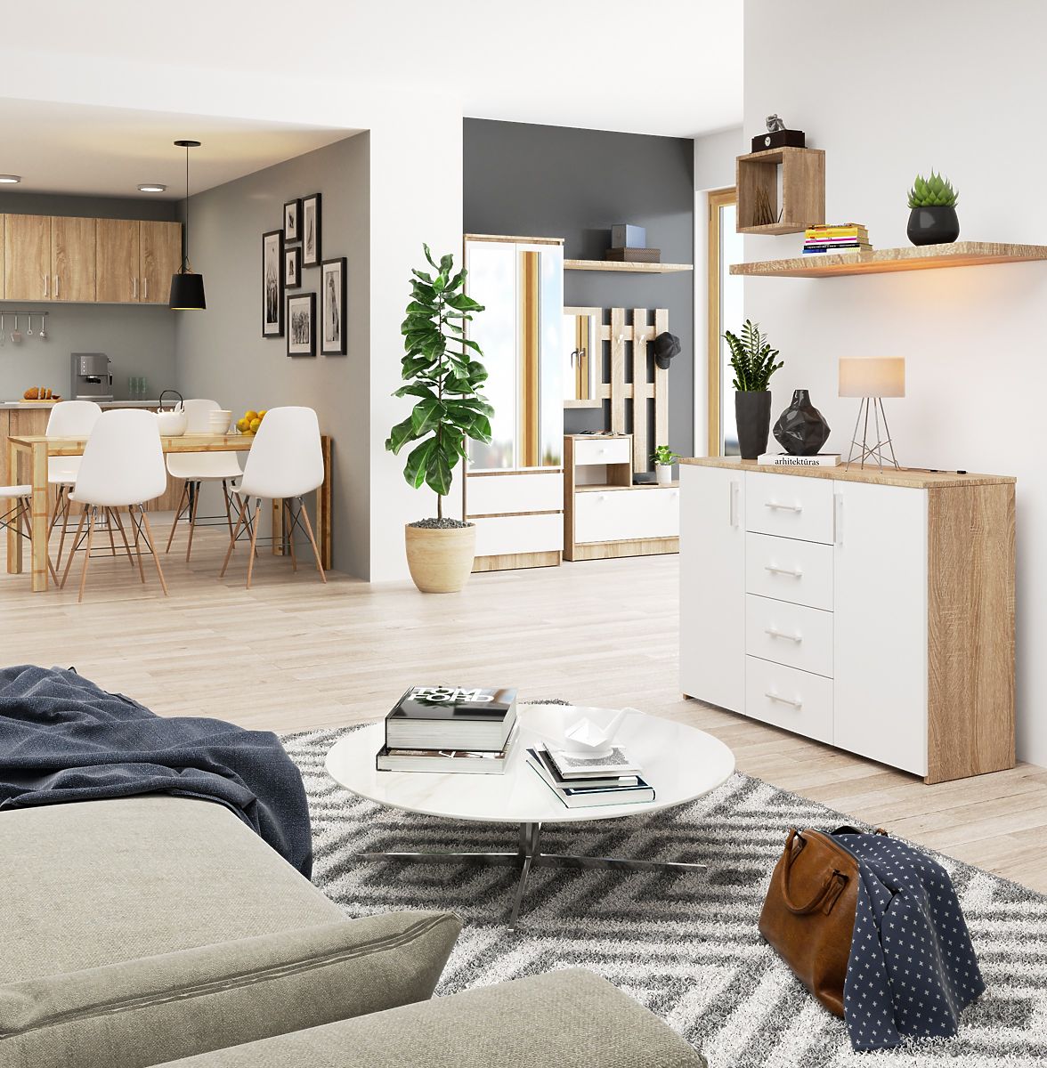 Komoda, model K 45, je vynikajúcou odpoveďou na potreby súčasných používateľov. Vyrobená v matnej bielej s prídavkom efektného dubu artisan je odrazom prírody a elegancie. Takéto nezvyčajné riešenie ponúka používateľom široké pole pre aranžmán, ktoré môže obmedzovať iba predstavivosť.
