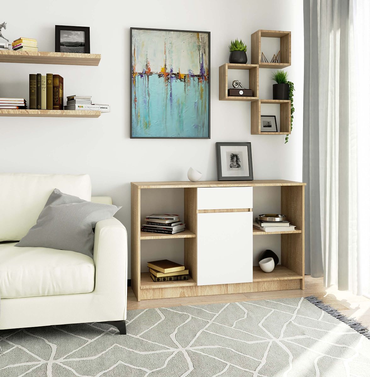 Inteligentné prevedenie komody B-17 ju robí vhodnou pre miestnosti ako obývacia izba, spálňa, predsieň alebo šatník. Spája otvorené police s uzavretou skrinkou a zásuvkou. Zásuvka má možnosť blokácie, čo umožňuje ukladanie cenných vecí. Je to skvelé miesto pre umiestnenie drobností, suvenírov a rôznych dekorácií. Kombinácia bielej a svetlého dreva ju robí vhodnou pre moderné aranžmány.