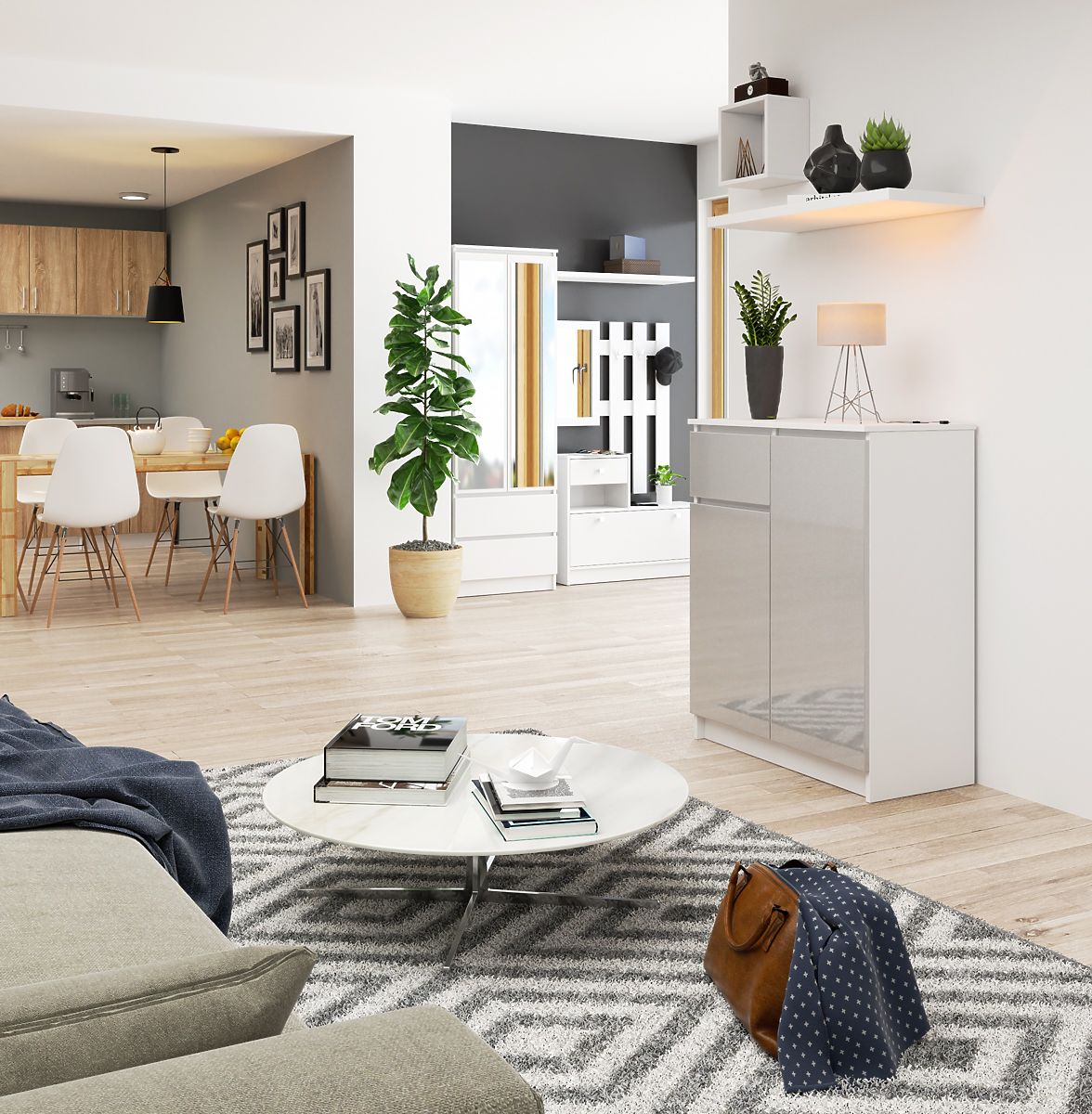 Komoda K 80 s 2 skrinkami a zásuvkou je vyrobená z odolnej nábytkovej dosky Kronospan. Korpus nábytku je biely, zatiaľ čo čelá skriniek a čelná doska zásuvky sú v metalickej farbe s vysokým leskom. Komoda je navrhnutá symetricky. Jej pravú časť tvoria dvierka otvárané smerom von a ľavú - samostatná zásuvka umiestnená tesne pod doskou a vysúvaná vďaka kovovým guľôčkovým pojazdom. Pod zásuvkou sa nachádzajú druhé dvierka, otvárané rovnako ako pravé - von z nábytku. Vo vnútri je komoda vybavená 4 policami rôznej výšky.