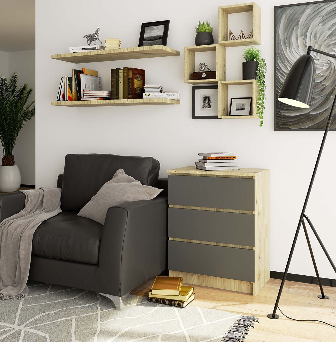 Komoda s tromi zásuvkami z laminovanej dosky Dub Artisan a grafitovo šedými čelami. .. viac