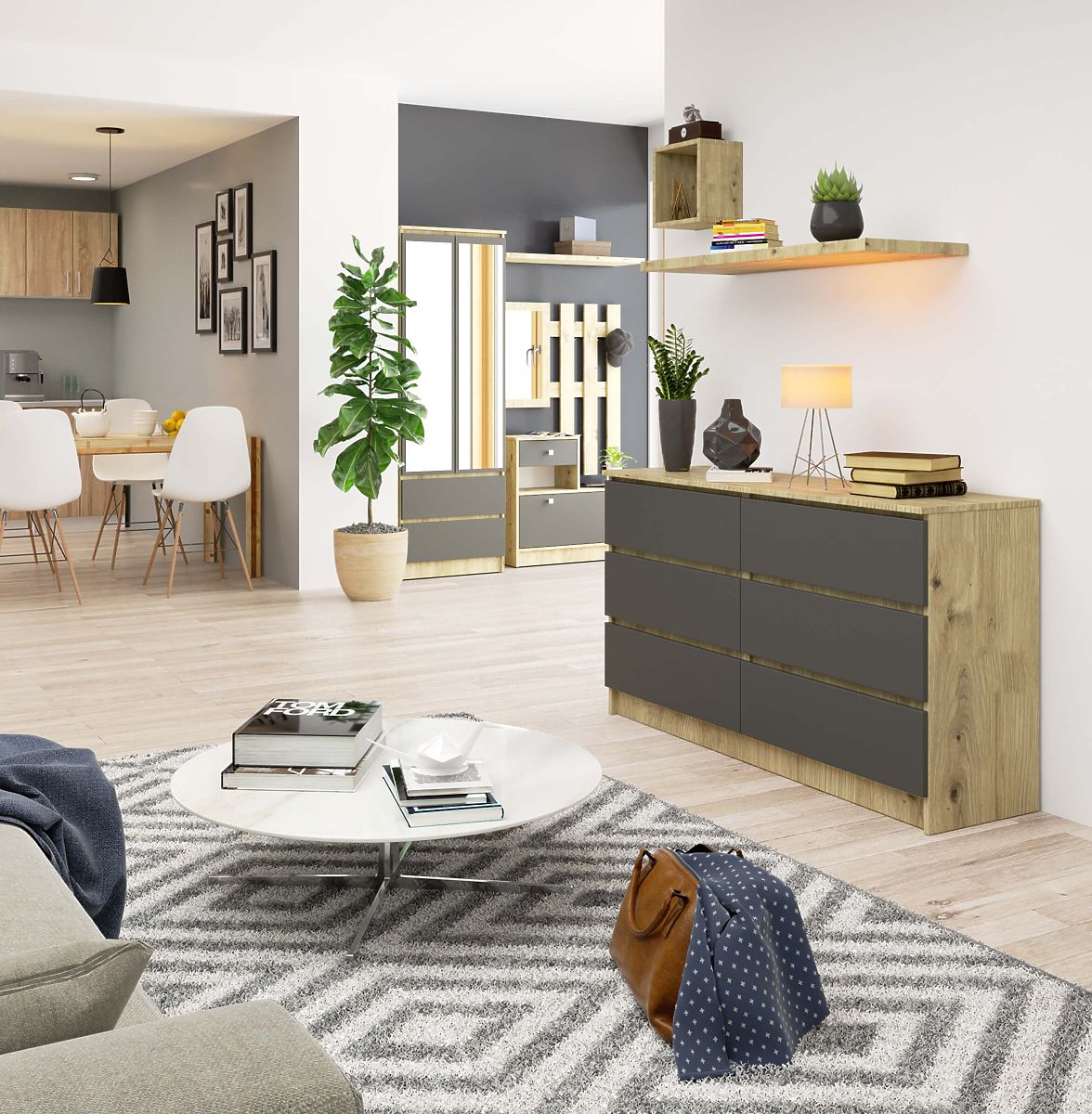 Komoda s 6 zásuvkami v prevedení Dub Artisan a Šedá. .. viac