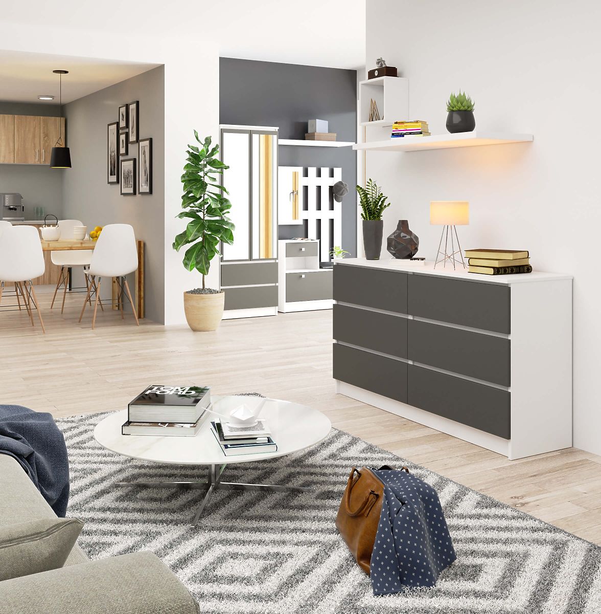 Komoda s 6 zásuvkami z laminovanej dosky, biela-grafitová sivá. .. viac