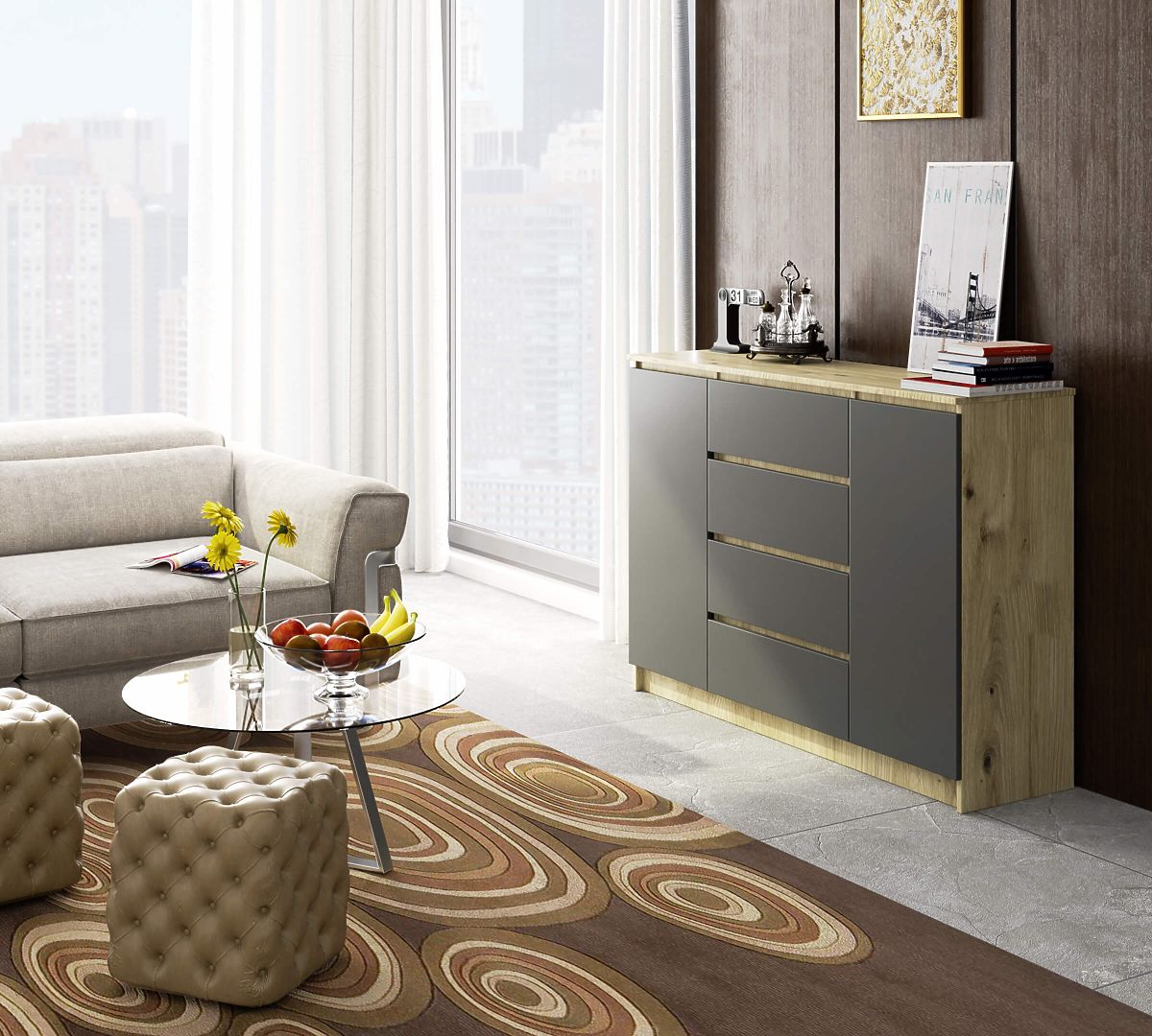 Komoda s 2 dverami a 4 zásuvkami v dubovom a šedom prevedení. .. viac