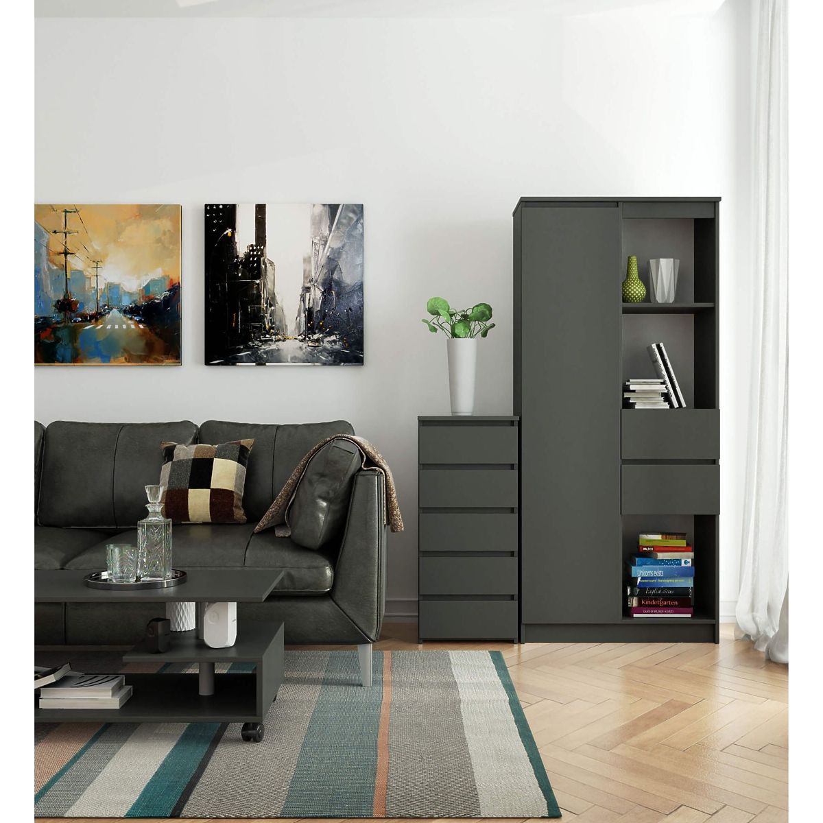 - elegantný vzhľad - komoda je jednoduchá vo forme, vyznačuje sa štýlovou farbou grafitová šedá,