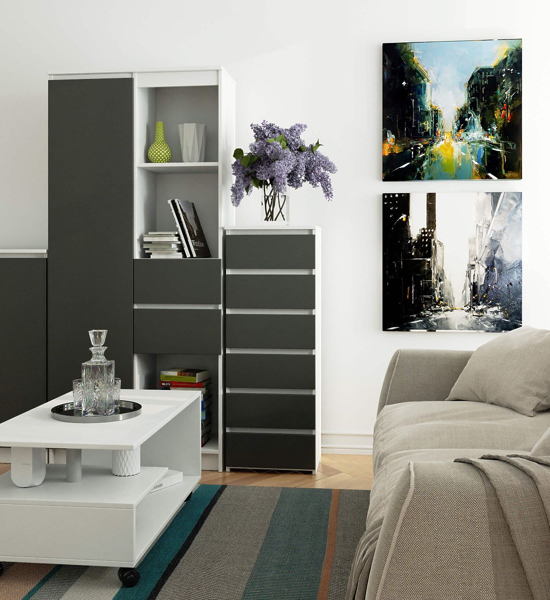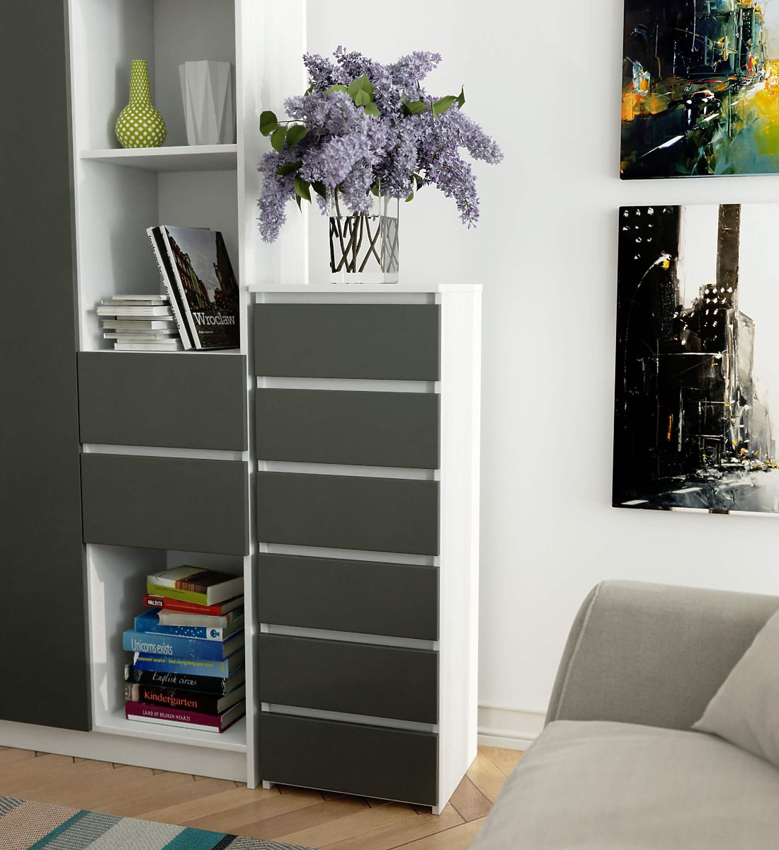 Komody sú obľúbeným typom nábytku, ktorý sa umiestňuje vedľa postele. Na jeho doske sa najčastejšie nachádza lampička, zatiaľ čo vo vnútri predmety uľahčujúce odpočinok a spánok. Tí, ktorí hľadajú elegantnú komodu, by mali venovať pozornosť komode CL6 40 cm v bielej farbe s čelami grafitovo šedými. Bude sa krásne vynímať v každej spálni. Môže byť tiež umiestnená do detskej izby.