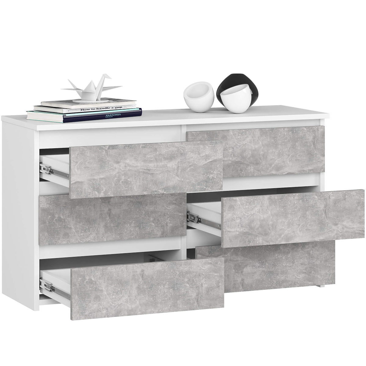 Biela komoda s betónovými čelami a šiestimi zásuvkami. .. viac
