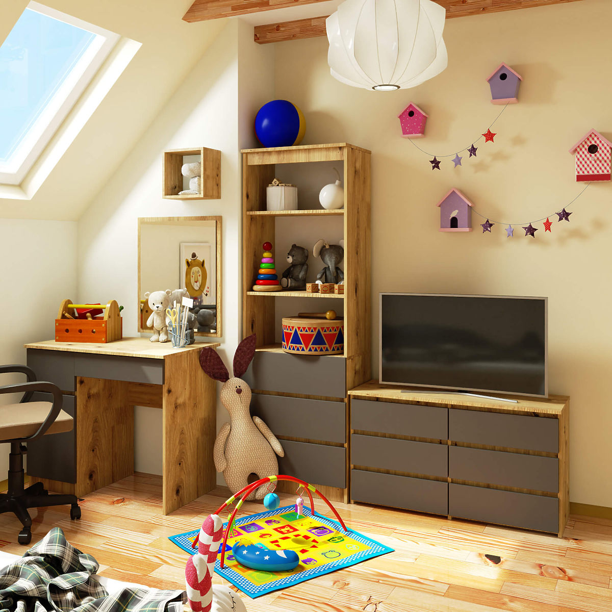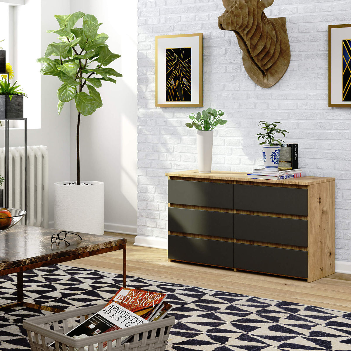 V nábytkárstve sa kladie zvláštny dôraz na funkčnosť produktov a ich vysoké estetické hodnoty. Skvelým príkladom je komoda CL 100 cm. Tento praktický kus nábytku je vyrobený z laminovanej dosky odolnej proti oderu, čo zaručuje jeho trvanlivosť a pevnosť. V šiestich priestranných zásuvkách sa zmestia rôzne knihy, dokumenty či drobnosti. Niektorí z našich zákazníkov sa rozhodujú pre ukladanie oblečenia alebo spodnej bielizne. Komoda dub artisan so šedými čelami má elegantný dizajn. Jednoduchá forma a elegantné prevedenie sa hodí ako do klasických a elegantných interiérov, tak aj do tých romantických. Tento výnimočný kus nábytku sa perfektne prezentuje v elegantnej obývacej izbe aj útulnej spálni. Býva tiež využívaný ako súčasť šatníka alebo predsiene. Komoda 6 zásuviek je oceňovaná ako individuálnymi zákazníkmi, tak podnikateľmi. Vďaka bezvadnému vzhľadu a neobyčajnej kapacite sa skvele hodí ako súčasť vybavenia kancelárií.