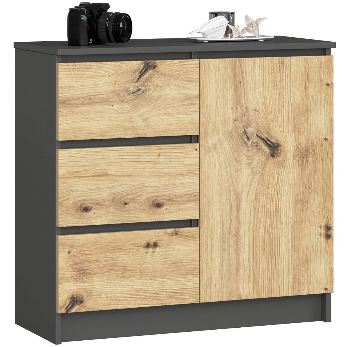 Malá komoda je súčasťou vybavenia, ktorá nájde uplatnenie v každej miestnosti. Moderné farby, pevná konštrukcia a precízne spracovanie viedli k vzniku skrinky, ktorá sa osvedčí napríklad v predsieni, obývacej či detskej izbe, ale aj v spálni. Môže byť využitá aj v kancelárskom priestore, kde umožní ukladanie mnohých dokumentov a ďalších kancelárskych potrieb. Komoda sa skladá z jedných dvierok (vnútri sa nachádzajú dve police) a 3 zásuviek. Nábytok kombinuje farby grafitová šedá a dub artisan.