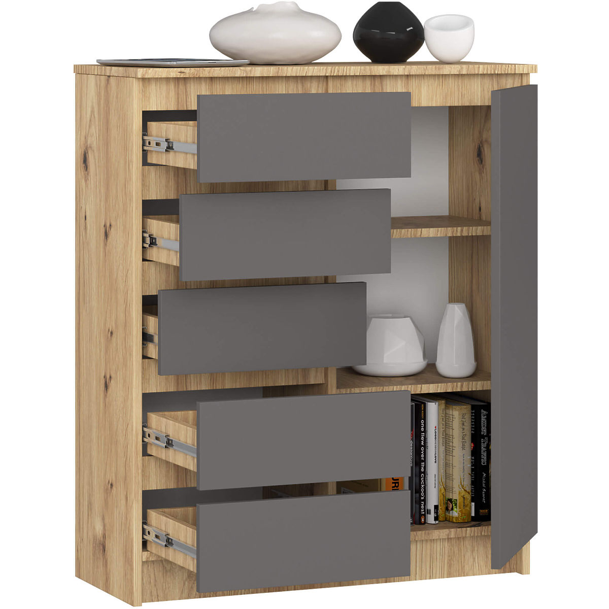 KOMODA 80 cm 5 ZÁSUVIEK 1 DVIERKA FARBA DUB ARTISAN GRAFITOVÁ ŠEDÁ