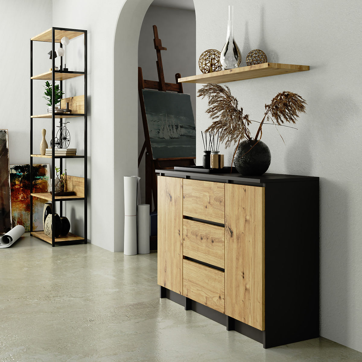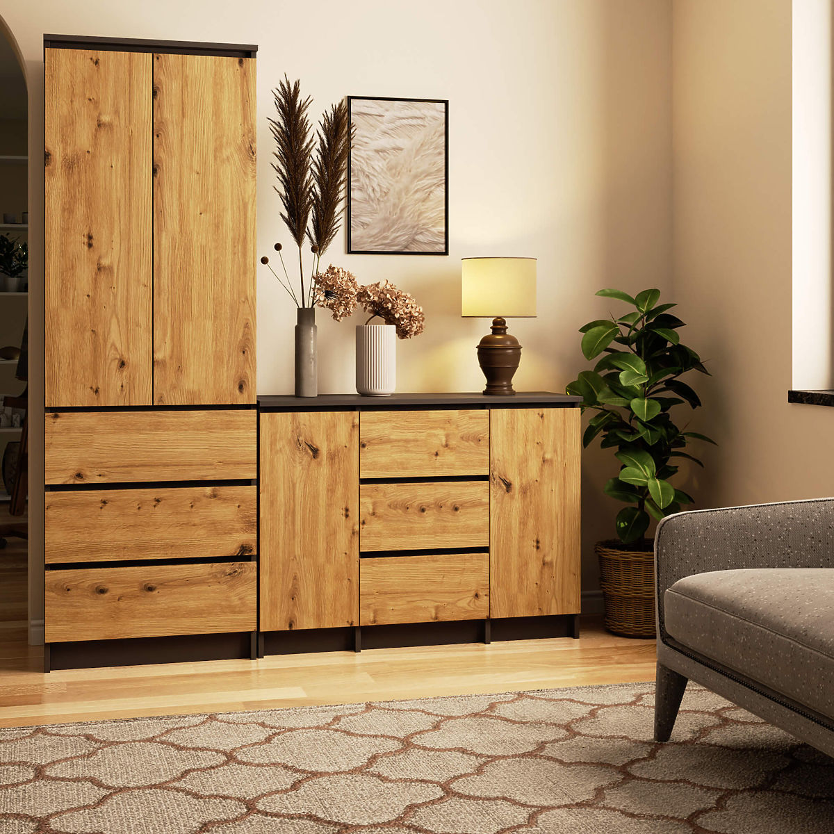 Komoda s grafitovo šedým telom a dubovým čelom. .. viac