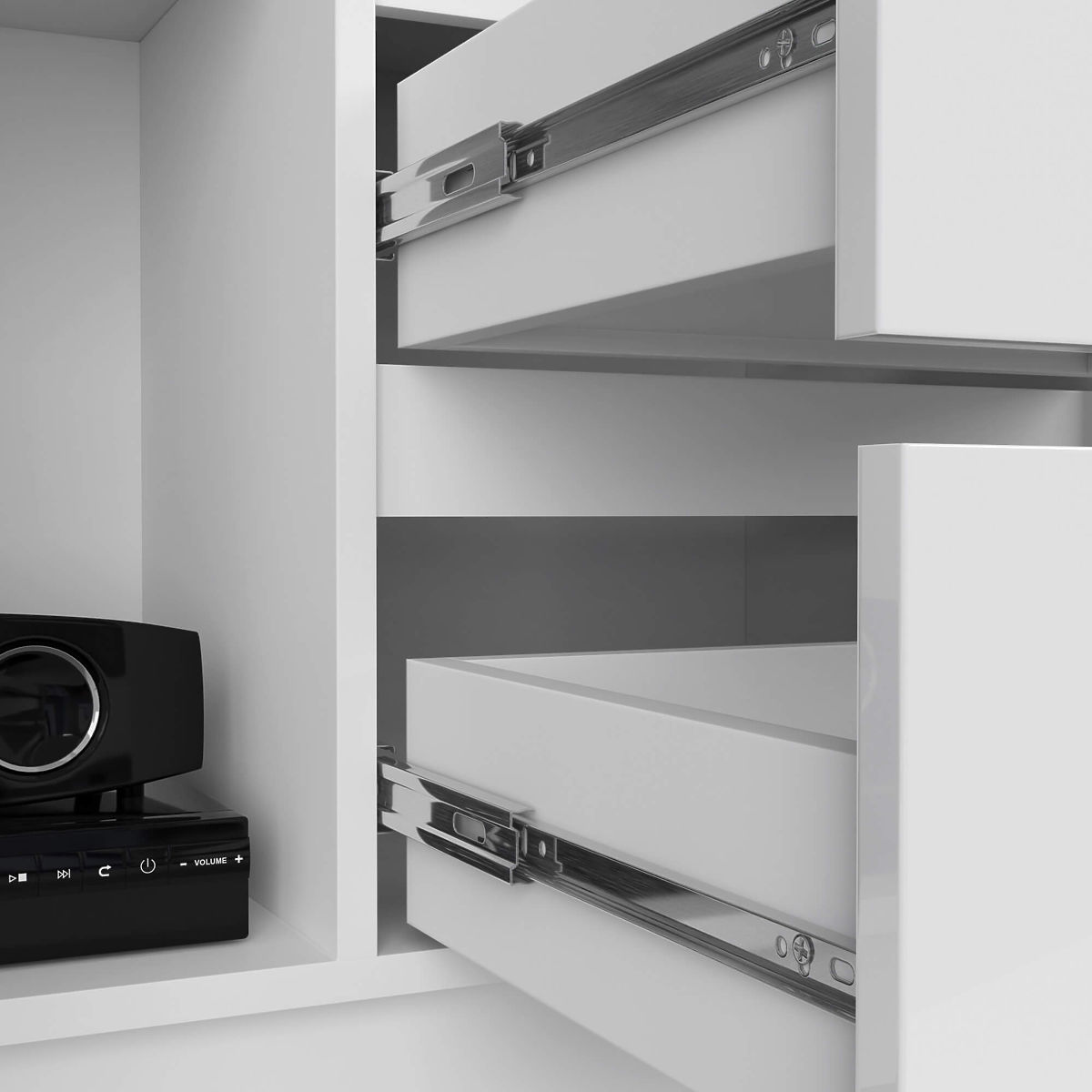 - Zásuvky sa pohybujú na kovových guľôčkových pojazdoch s blokáciou vysunutia