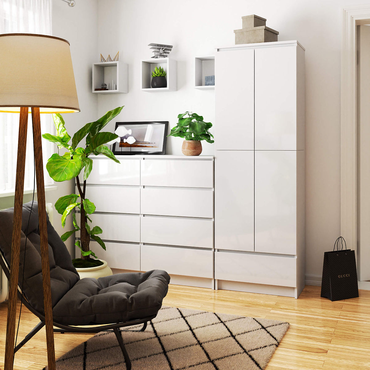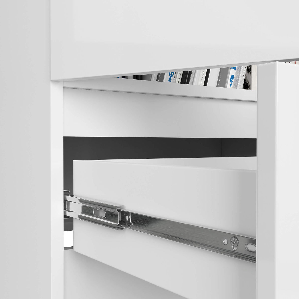 Biela kancelárska knižnica so zásuvkou je dokonalou kombináciou funkčnosti a vizuálnej príťažlivosti. Nábytok je praktický a ľahko udržiavateľný v dokonalej čistote, a zároveň je veľmi efektný. V uzavretej časti sa nachádzajú priestranné police, zatiaľ čo v spodnej časti je priestranná a ľahko vysúvateľná zásuvka. Použitie knižnice je veľmi univerzálne a závisí od individuálnych potrieb. V skrini môžu byť uložené knihy, zakladače s dokumentmi a kancelárske potreby, rovnako ju možno použiť na stolový riad, obrusy či uteráky. Farba klasickej bielej a jednoduchý tvar knižnice zaručujú, že nábytok sa hodí do akéhokoľvek interiéru, bez ohľadu na farbu stien či štýl, v ktorom je zariadený. Nábytok je vyrobený z odolného materiálu, ktorým je laminovaná doska odolná proti opotrebeniu a poškodeniu. Hrany skrine sú potiahnuté trvanlivou a estetickou ABS hranou. Čelá knižnice sú lakované na vysoký lesk, čo nábytku dodáva ďalšiu eleganciu. Horné a dolné dvere sú spojené do jedného celku a nie sú otvárané samostatne.