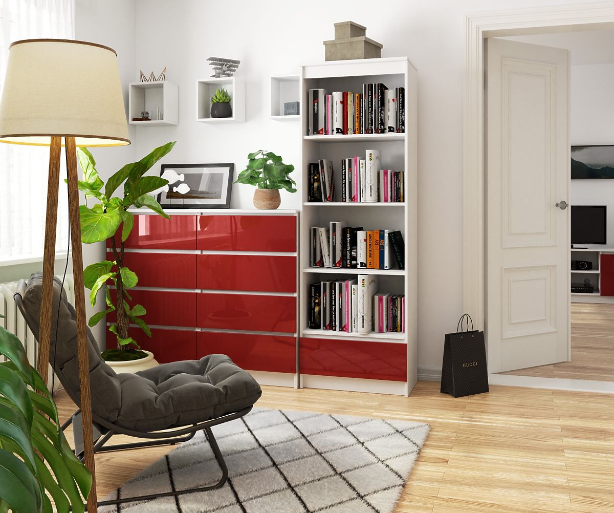 Regál má štyri police a v dolnej časti jednu priestrannú zásuvku. Korpus nábytku je vyrobený z laminovanej dosky odolnej proti oderu a mechanickému poškodeniu v bielej farbe. Čelo zásuvky je vyrobené z lakovanej MDF dosky s vysokým leskom v krásnom odtieni červenej. Regál vyzerá veľmi efektne a hodí sa do interiérov zariadených v modernom štýle. Zaujímavá kombinácia klasickej bielej a hlbokej červenej farby robí nábytok, aj keď jednoduchý, originálnym a priťahuje pozornosť. Červeno-biely regál možno použiť na knihy, šanóny s dokumentmi, dekoratívne krabice na drobnosti alebo na fotoalbumy. Nábytok má natoľko univerzálne použitie, že môže rovnako dobre doplniť vybavenie firemnej kancelárie, ako aj študentskej izby alebo domácej pracovne. Regál možno ľahko udržiavať v dokonalej čistote utieraním políc a čela vlhkou handričkou. Nábytok sa vyznačuje starostlivým spracovaním a dokonalým zakončením hrán trvanlivou a estetickou ABS hranou.
