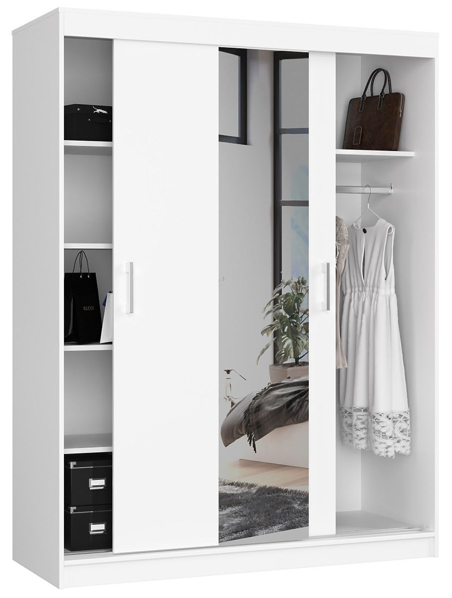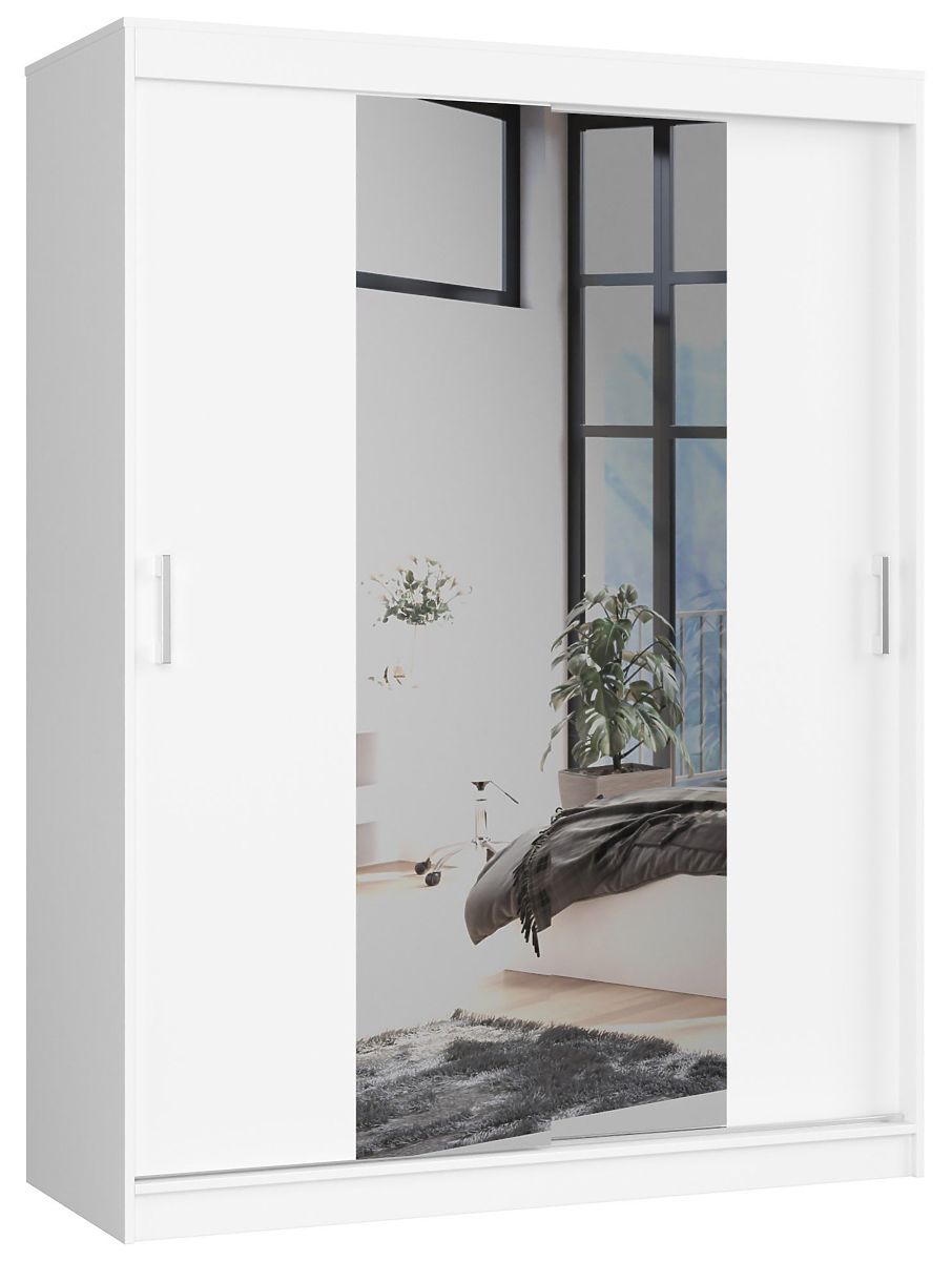 Dvojdverová posuvná skriňa 150 cm CLP so zrkadlom je biely návrh, ktorý sa určite uplatní v spálni, predsieni alebo v izbe pre mládež. Nábytok umožňuje ukladanie oblečenia a mnohých ďalších predmetov, poskytuje priestor na zavesenie búnd, sák, košieľ, šiat alebo dlhých kabátov a praktické police. Tento návrh kombinuje elegantný, minimalistický vzhľad a vysokú kvalitu, ktorá je výsledkom kvalitných materiálov a starostlivosti o všetky detaily. Nábytok je vybavený veľkým zrkadlom, ktoré dokáže opticky zväčšiť miestnosť.