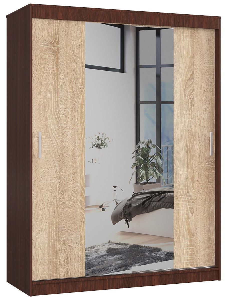 Veľká skriňa vybavená posuvnými dverami ľahko pojme všetko oblečenie, obuv, kabelky a mnoho ďalších potrebných vecí v spálni alebo predsieni. Prezentovaný model 150 cm CLP so zrkadlom je určený pre milovníkov stále obľúbenej farebnej kombinácie wenge/sonoma. Nábytok sa vyznačuje vysokou kvalitou spracovania z kvalitných, trvanlivých a odolných materiálov. Je to návrh, ktorý možno smelo využiť nielen v obytnom priestore, ale aj napríklad v kancelárii. Skriňa sa najčastejšie používa v spálňach, kde umožňuje ukladanie predovšetkým odevov - ako na početných policiach, tak na praktickej tyči.