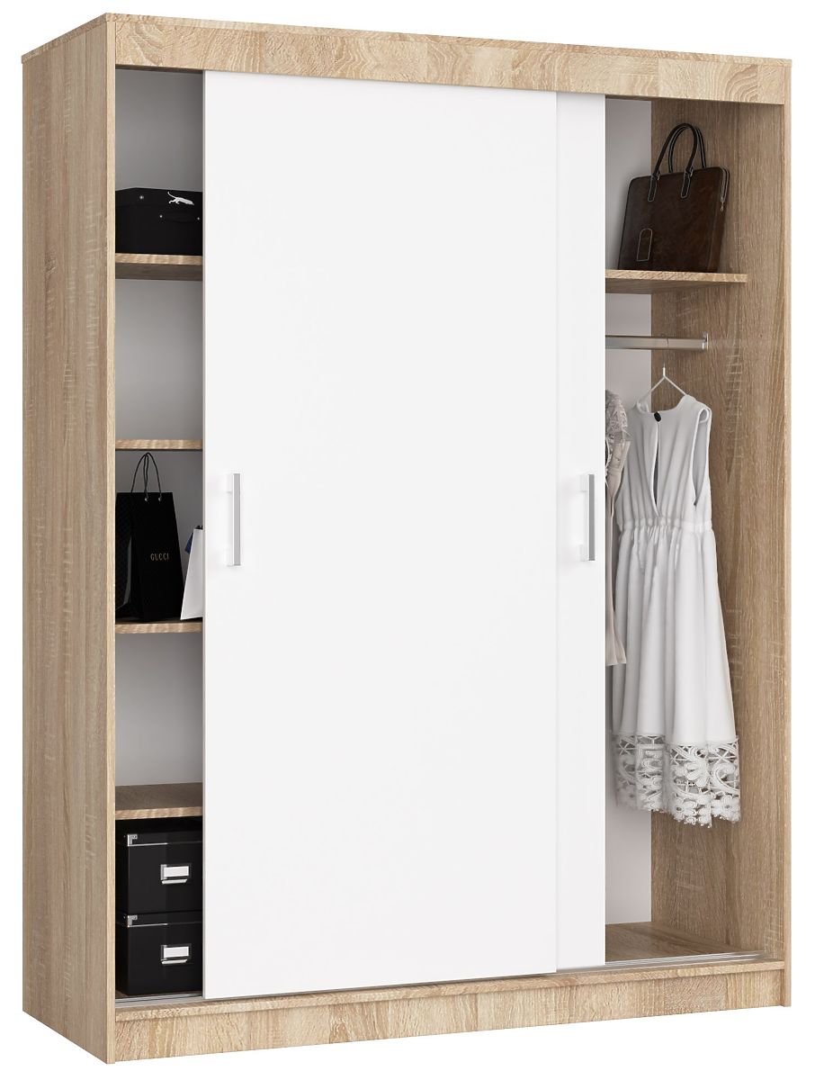 Posuvná skriňa 150 cm CLP MONO SONOMA/BIELA je kus nábytku, v ktorom pohodlne umiestnite všetko svoje oblečenie. Ocenia ju ako ženy, ktoré majú rady poriadok, tak praktickí muži. Nájdete tu miesto na svetre, blúzky, tričká, nohavice, sukne a obľúbené šaty. Voľne zavesíte dlhší kabát aj teplú bundu či oblek. Schováte tiež topánky, čiapky, šály alebo rukavice. Táto priestranná skriňa sa bude hodiť do miestností zariadených v modernom, minimalistickom štýle. Podčiarkne ich charakter a tiež presvetlí nedostatočne osvetlený interiér, akým je zvyčajne predsieň.