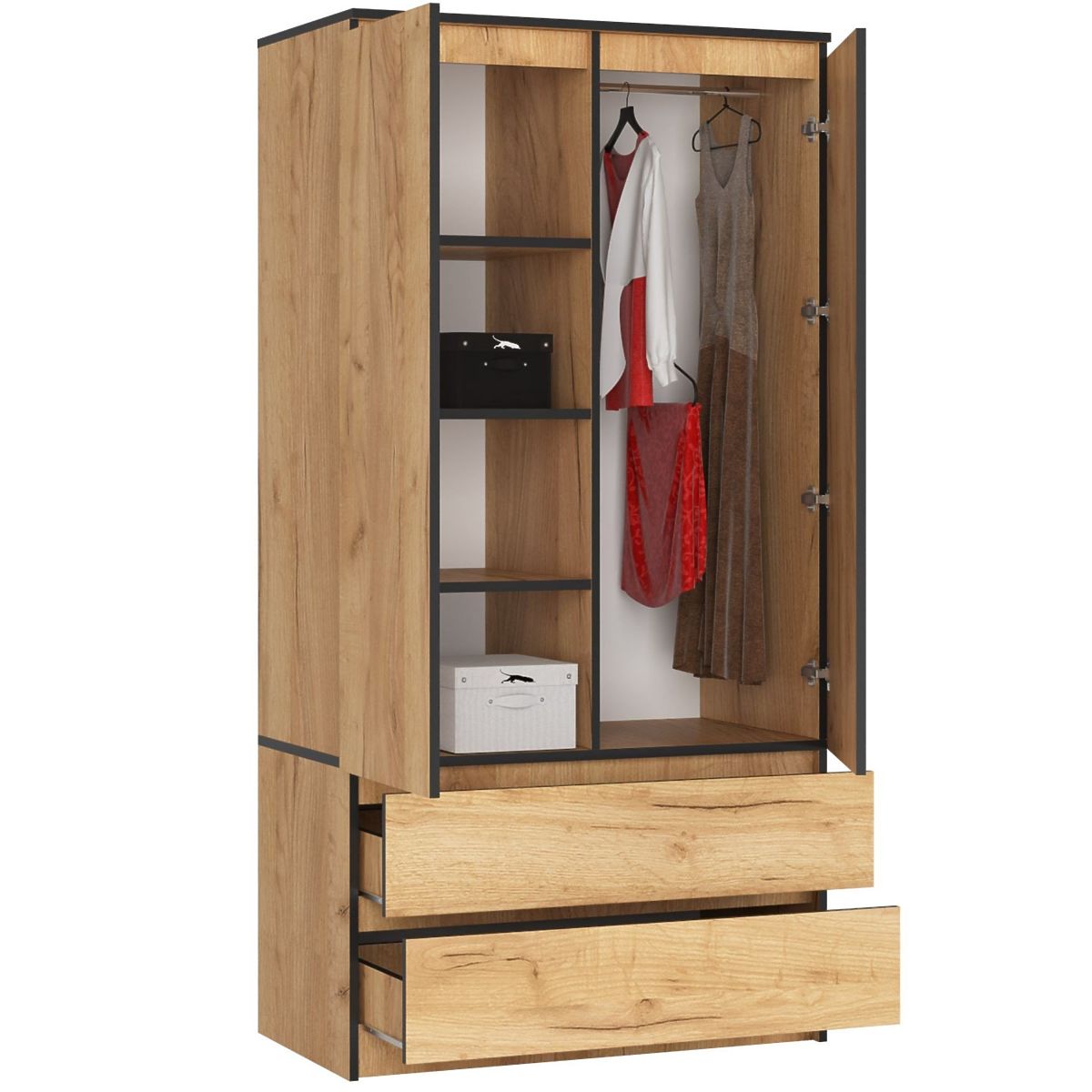 Dvojdverová šatníková skriňa je vyrobená z odolnej laminovanej dosky. Korpus nábytku je celý v farbe dub craft. Dolnú časť skrine tvoria dve zásuvky umiestnené paralelne nad sebou, zatiaľ čo horný, vyšší segment je rozdelený na dve časti. Ľavá obsahuje rad 4 políc, zatiaľ čo pravá, vybavená tyčou, je určená na zavesenie oblečenia.
