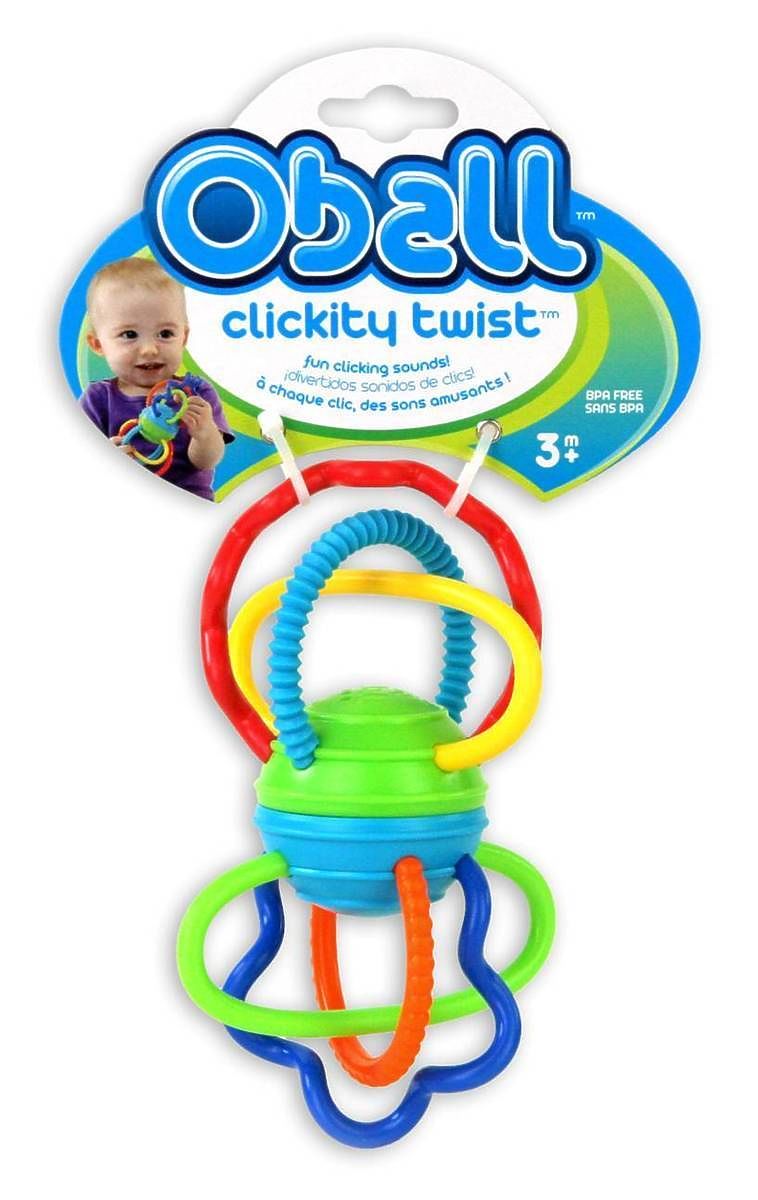 Zábavné hryzátko Oballo Clickit Twist - hračka do ruky v žiarivých farbách, ktorá vydáva zábavné zvuky.