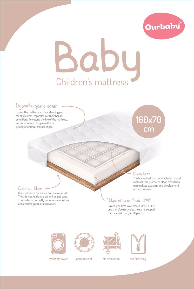 Detský matrac BABY s rozmerom 70x160 cm vhodný pre citlivú detskú pokožku. Obojstranný matrac zložený z 3 vrstiev (pohánka, PUR pena, kokos). Spánok na strane s pohánkou alebo na strane z kokosu? Deti si môžu vybrať, ktorá strana im je pohodlnejšia alebo podľa ročného obdobia. Matrac stačí jednoducho otočiť.