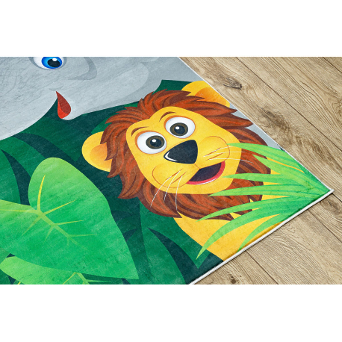 Objavte svet plný dobrodružstiev s detským umývacím kobercom BAMBINO 2705, ktorý prináša motív afrických zvieratiek v príjemnej zeleno-hnedej farebnej kombinácii. Tento koberec rozžiari každú detskú izbu a vytvorí prostredie, ktoré podporuje fantáziu, hru aj učenie. Slony, levy, žirafy a ďalší zvierací kamaráti sprevádzajú vaše dieťa pri každodenných aktivitách a premenia obyčajný priestor na hravé safari. Koberec je vyrobený zo 100% polyesteru, čo zaisťuje mäkký a príjemný povrch, ktorý je zároveň odolný a ľahko udržiavateľný. Hrúbka 5 mm poskytuje pohodlie pri sedení aj hraní, zatiaľ čo ľahká konštrukcia umožňuje jednoduchú manipuláciu. Veľkou výhodou je možnosť prania v práčke – vďaka tomu je koberec vždy čistý a hygienický. Protišmyková spodná vrstva zabraňuje kĺzaniu a zaisťuje bezpečnosť pri pohybe detí.