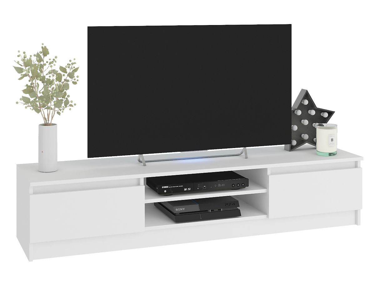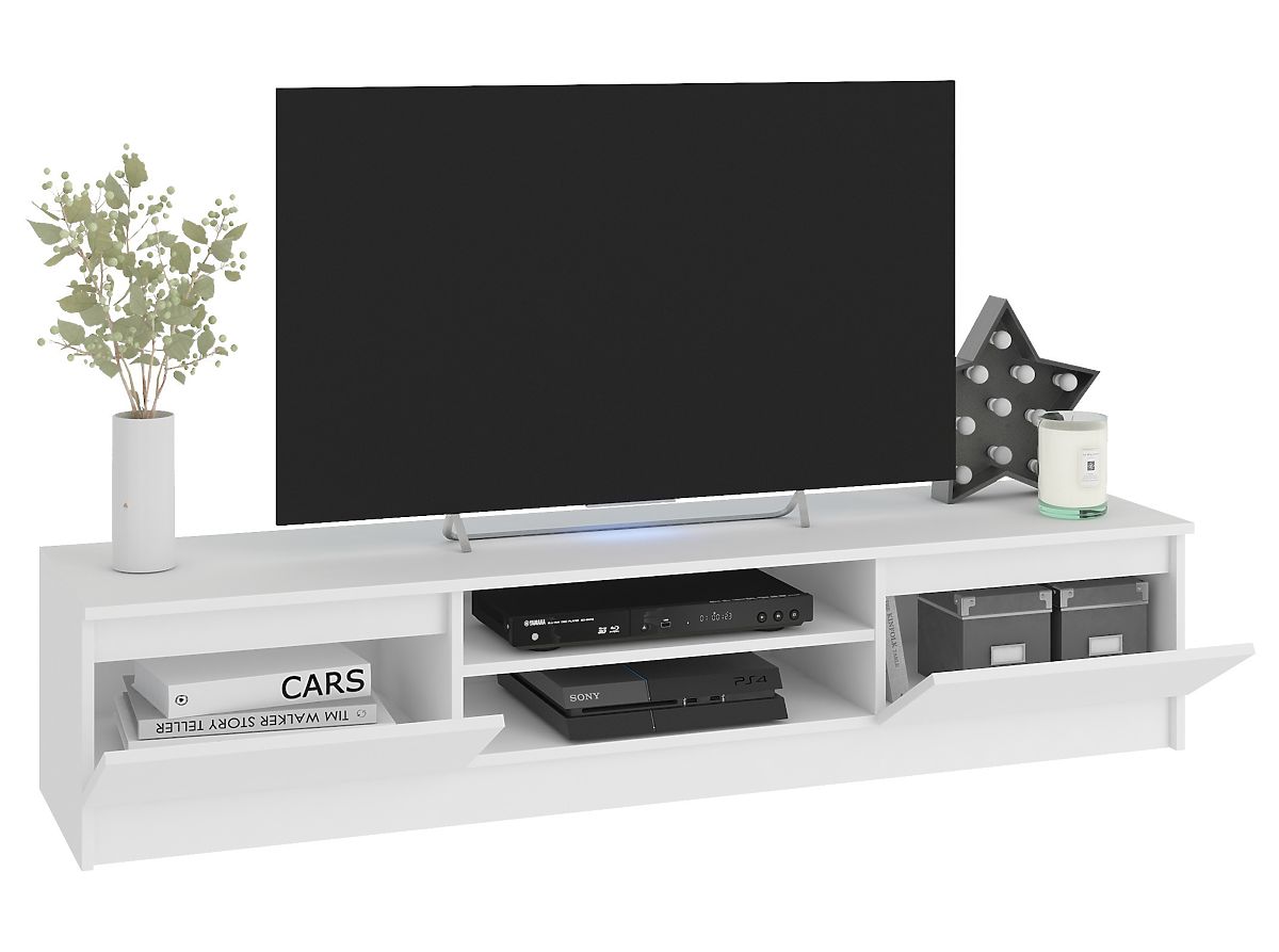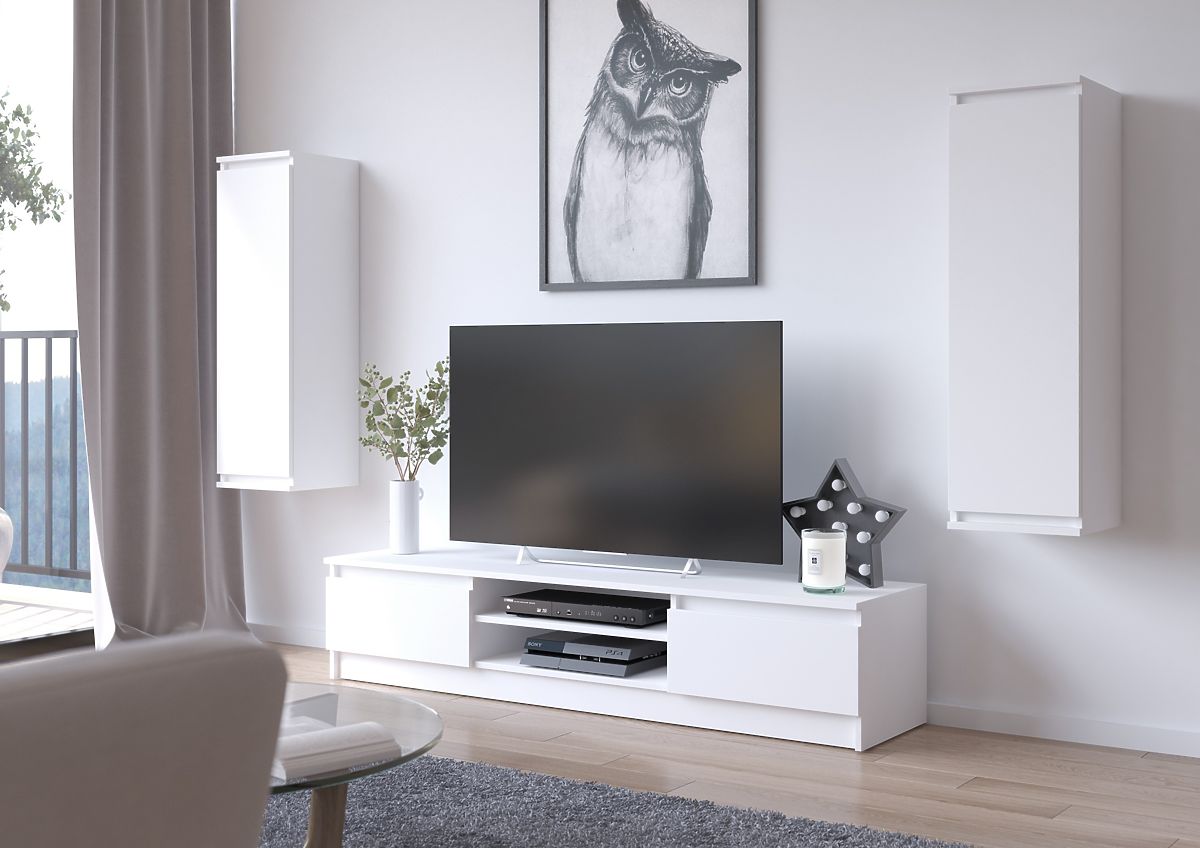 Sada nábytku, skladajúca sa z TV skrinky a dvoch závesných skriniek, môže byť funkčným vybavením obývacej izby, pracovne alebo študentskej izby. TV skrinka má veľkú dosku, na ktorú možno umiestniť televízor ľubovoľnej veľkosti a dekoratívne prvky. Nábytok je vybavený praktickými policami na elektroniku a bočnými úložnými priestormi s výklopnými dvierkami, kde možno uložiť DVD, počítačové príslušenstvo alebo iné drobnosti. TV stolík v kombinácii so závesnými skrinkami po jeho stranách tvorí vizuálne atraktívnu kompozíciu. Nábytok zaberá málo miesta, čo ho robí vhodným nielen pre veľkú obývaciu izbu, ale aj pre menšie priestory.