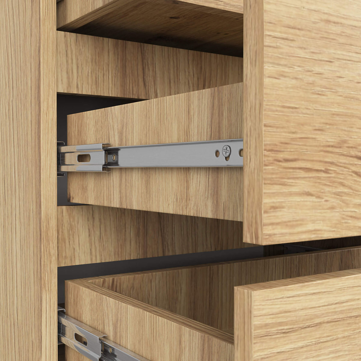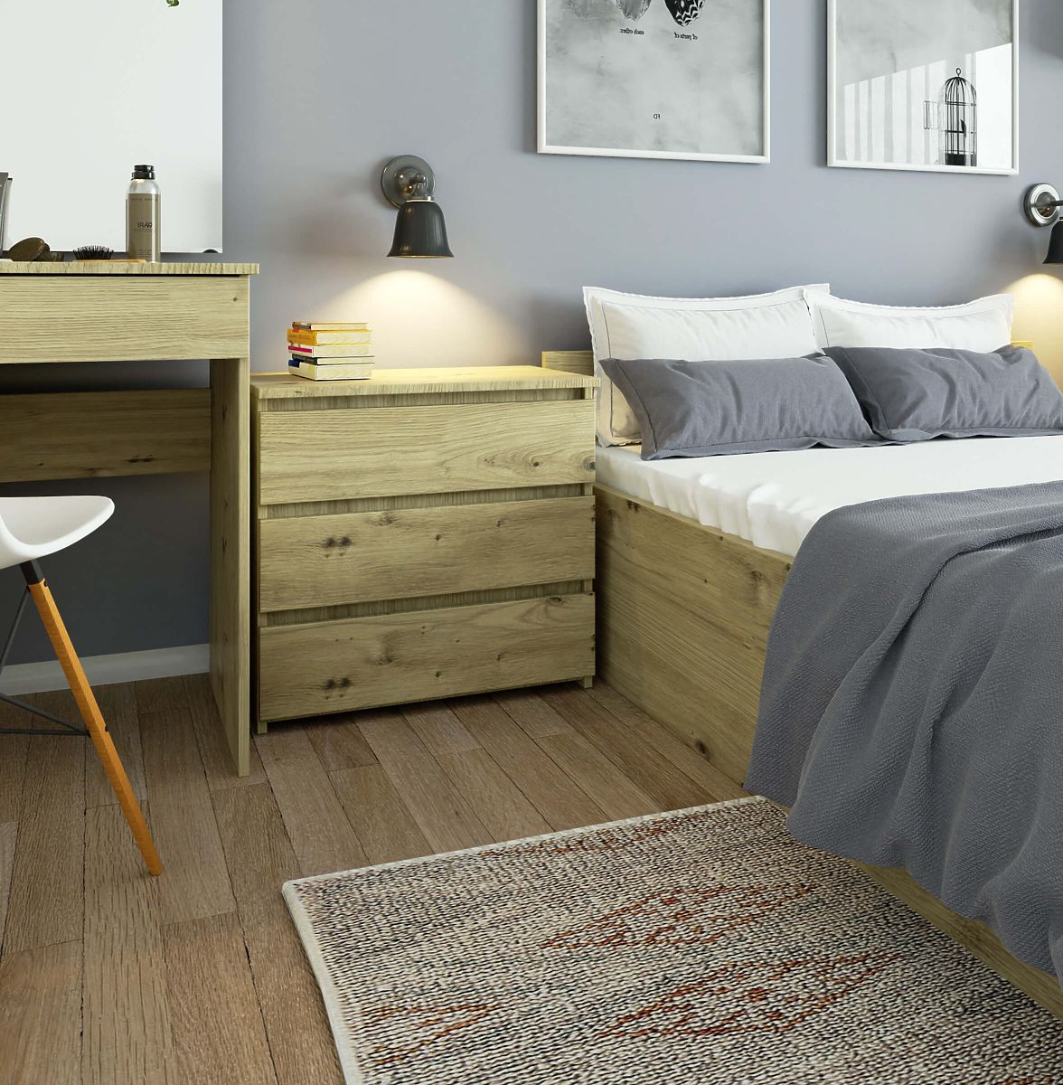Komoda dub artisan má 3 ľahko otvárateľné zásuvky. Skvele sa hodí do spálne ako nepostrádateľný prvok jej vybavenia. Do zásuviek možno uložiť spodnú bielizeň, kozmetické doplnky alebo náhradnú posteľnú bielizeň. Doska je ideálna na umiestnenie nočnej lampičky a odloženie zaujímavého čítania. Nábytok možno umiestniť aj do detskej izby a do spálne tínedžera.