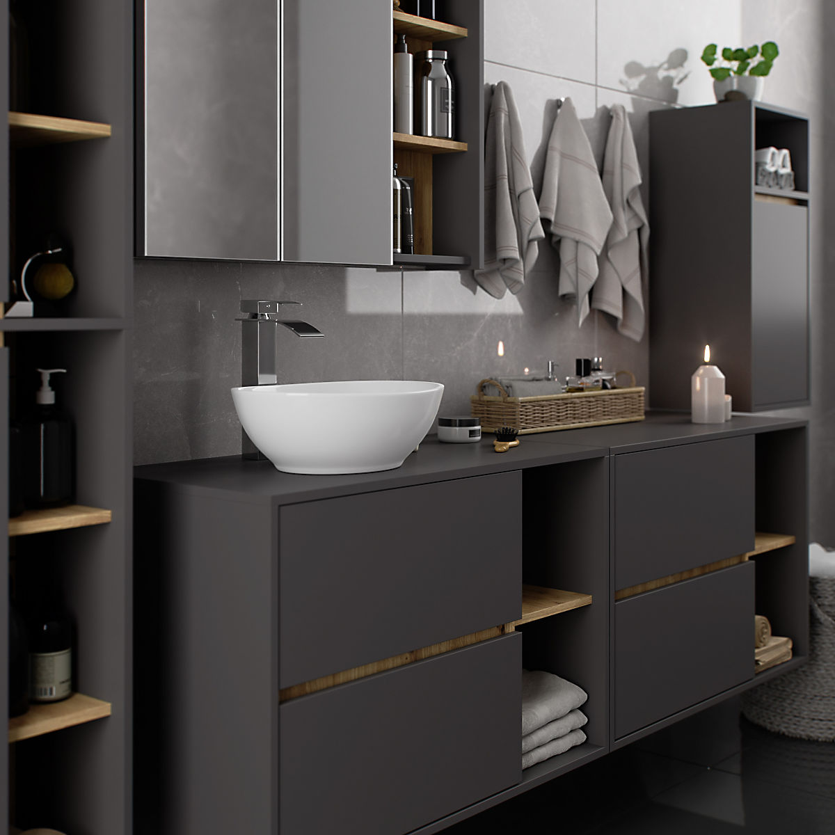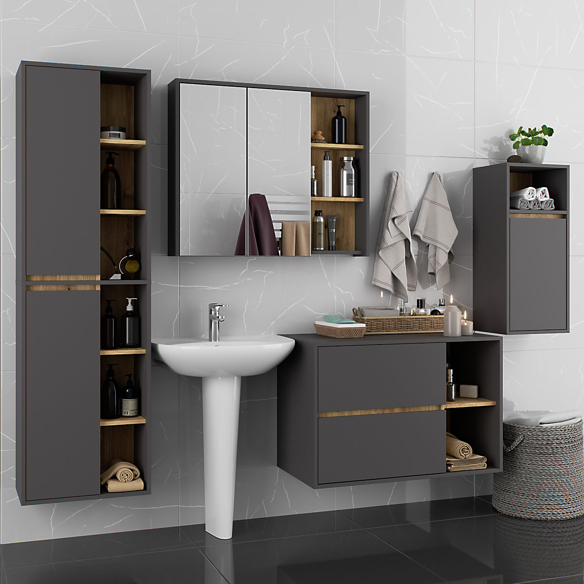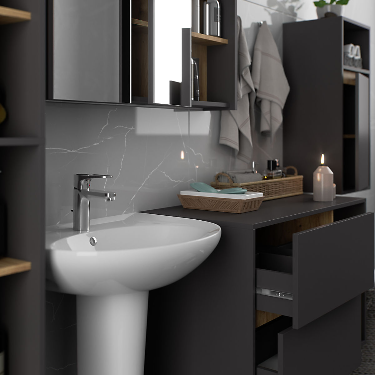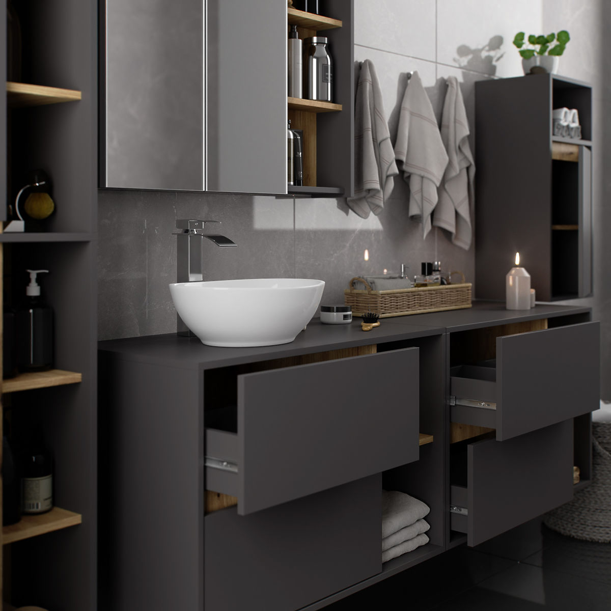 Kúpeľňové skrinky skvele dopĺňajú vybavenie kúpeľne, poskytujú potrebné miesto pre všetku kozmetiku a detergenty a dodávajú kúpeľni určitý štýl. Priestranné skrinky uľahčujú udržiavanie poriadku v miestnosti, čo priaznivo ovplyvňuje estetiku interiéru. Kolekcia VAMI sa vyznačuje pútavou štýlovou farebnosťou – korpus a čelá majú rovnakú farbu, zatiaľ čo vnútorná farba je odlišná.