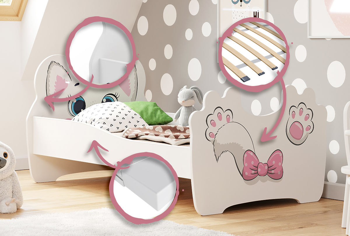 Detská posteľ s roztomilou potlačou ružovej mačičky je ideálnym riešením pre malú milovníčku rozprávkových motívov. Roztomilý vzor na čele a nožnej časti postele robí z nábytku nielen miesto na spanie, ale aj výnimočnú ozdobu detskej izby. Jemné farby a rozprávkový motív vnesú do interiéru radostnú atmosféru, ktorá podporuje ako odpočinok, tak kreatívnu hru.