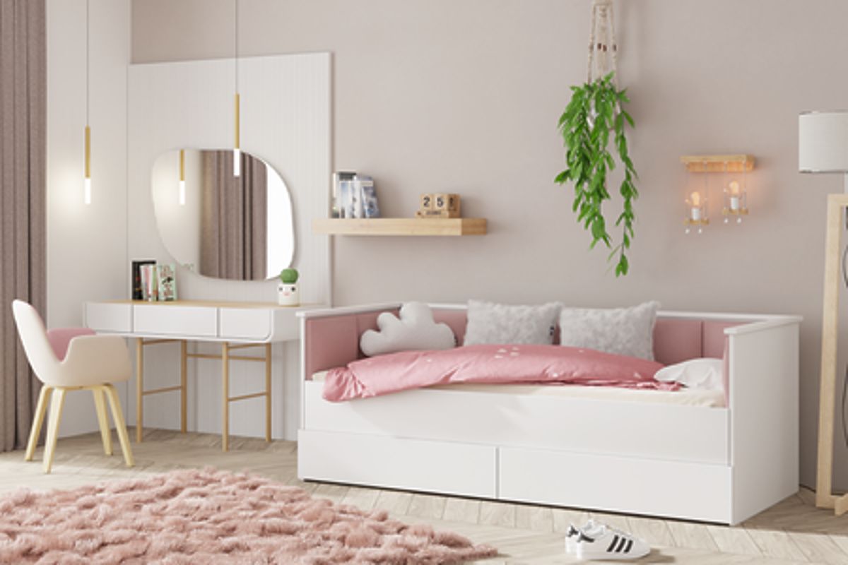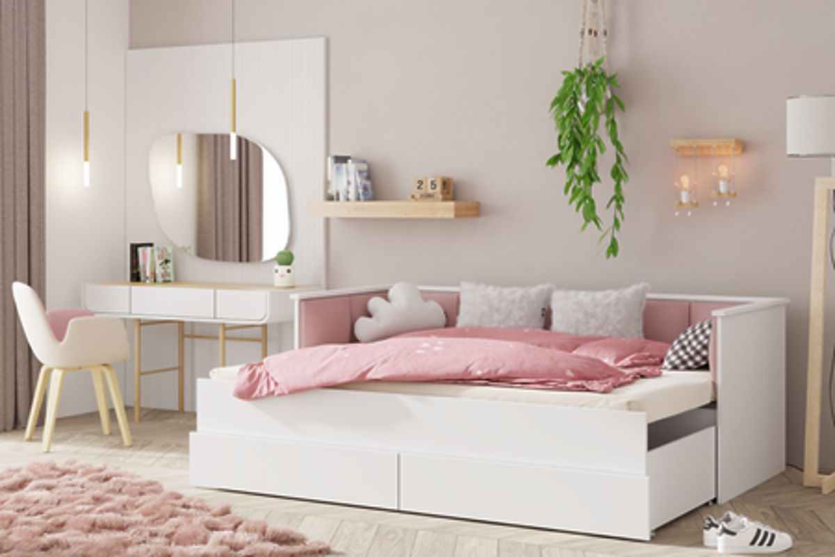 Minimalistický dizajn postele HELIOS, obohatený o čalúnené panely z vysoko kvalitného materiálu typu velvet, dodáva interiéru moderný a elegantný charakter. Panely nie sú len estetickým doplnkom, ale aj praktickým prvkom, ktorý poskytuje pohodlnú oporu pri čítaní, sledovaní televízie alebo štúdiu. Mäkký a príjemný na dotyk materiál dodáva teplo a útulnosť, podčiarkujúc priateľský charakter izby pre mládež. Navyše je posteľ vybavená dvoma priestrannými zásuvkami na guľôčkových pojazdoch, ktoré umožňujú ukladanie posteľnej bielizne, oblečenia alebo iných drobností. Toto riešenie nielen pomáha udržiavať poriadok, ale aj optimálne využíva priestor, čo je zvlášť dôležité v menších izbách.