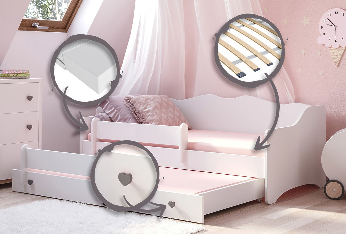 Posteľ Emma vyniká svojou funkčnosťou, ktorú ocenia ako deti, tak ich rodičia. Vďaka pevnej konštrukcii z certifikovanej nábytkovej dosky posteľ unesie zaťaženie až 110 kg, čo zaisťuje dlhodobé používanie. Bezpečnosť dieťaťa zaisťujú zaoblené hrany a odnímateľné ochranné zábrany, ktoré možno ľahko prispôsobiť potrebám dieťaťa. Rošt FLEX s pružnými lamelami zaručuje pohodlný a komfortný spánok. Navyše, dolná posteľ, aj keď nie je určená na ukladanie vecí, môže poskytnúť pohodlné a bezpečné miesto na spanie pre druhé dieťa, čo šetrí priestor v izbe.