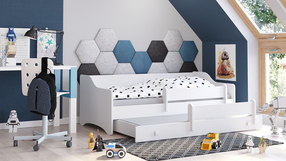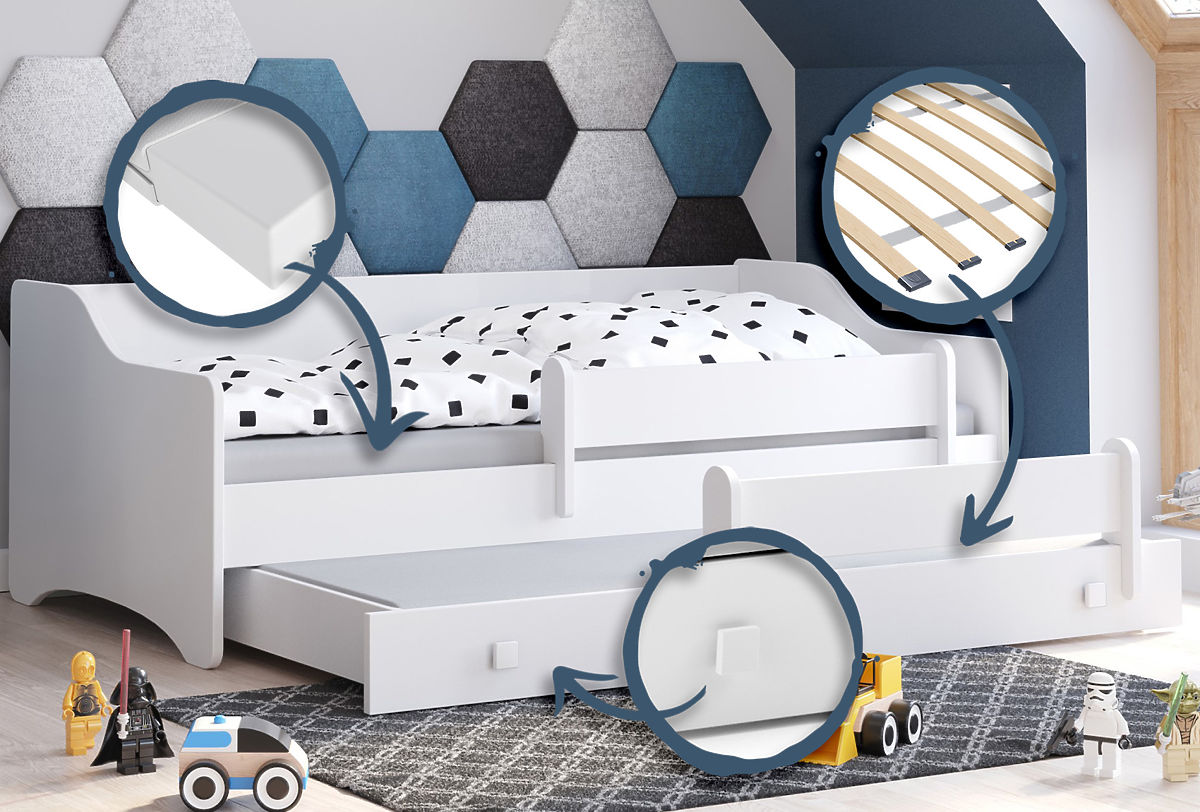 Vďaka pevnej konštrukcii a odolným materiálom posteľ Eryk zaručuje stabilitu a dlhú životnosť. Zaoblené hrany a pohyblivá ochranná zábrana zabezpečujú, že dieťa je počas spánku v bezpečí, a pružný rošt FLEX s pružinovými lamelami poskytuje pohodlie a správnu podporu. Dolná spacia plocha, aj keď nie je určená na ukladanie vecí, je ideálnym riešením pre pohodlné spanie pre súrodencov alebo priateľov, ktorí môžu tráviť čas spolu. Posteľ Eryk je kombináciou elegancie, praktickosti a bezpečnosti, ktorá bude slúžiť po mnoho rokov.