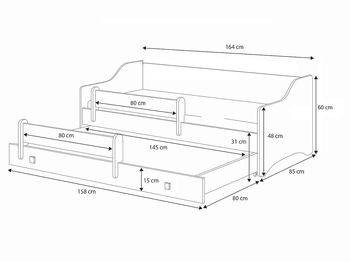 Posteľ Eryk je funkčné a štýlové riešenie pre každého chlapca. S dvoma spacím plochami, hornou 160x80 cm a dolnou 145x80 cm, je ideálna pre izbu, kde je priestor vzácny. Jej elegantný dizajn a trvanlivé materiály zabezpečujú nielen estetiku, ale aj bezpečnosť a komfort používania po mnoho rokov. Je to vynikajúca voľba pre rodičov, ktorí chcú vytvoriť pohodlné a bezpečné miesto na spanie pre svoje dieťa.