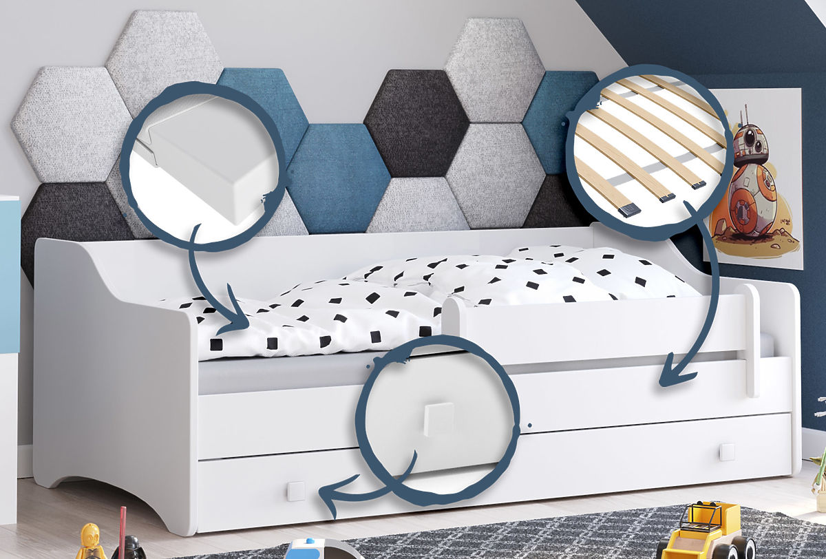 Vyrobená z vysoko kvalitnej nábytkovej dosky, posteľ Eryk zaručuje pevnosť a odolnosť proti poškodeniu. Navyše, prírodné jedľové drevo, z ktorého je vyrobený rám, prináša do interiéru teplo a prirodzený pôvab. Posteľ má zaoblené hrany, čo minimalizuje riziko úrazov, a praktickú zásuvku na posteľnú bielizeň alebo hračky, čo pomáha udržiavať poriadok v izbe. Pohyblivá zábrana poskytuje dodatočnú ochranu dieťaťu a rám FLEX s pružinovými lamelami zaručuje pohodlný spánok. Je to ideálna voľba pre každého rodiča, ktorý si cení bezpečnosť, pohodlie a estetiku.