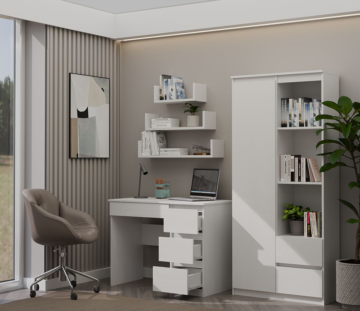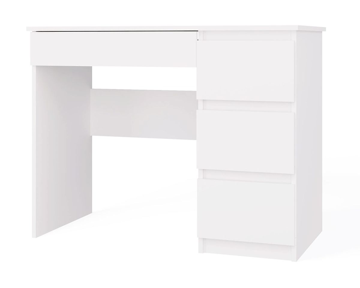 FARBA: BIELA Písací stôl model „MIJAS“ sa skvele hodí ako do domácich izieb, tak aj do kancelárie. ideálne miesto pre notebook čela zásuviek bez úchytiek 3 priestranné vysoké zásuvky vľavo a jedna nízka vpravo pod doskou stola funkčnosť jednoduchá a moderná konštrukcia vytvára pohodlný pracovný priestor hladké boky bez krytiek ľahká montáž montážny návod v balení český výrobca (ak chcesz, mogę zostawić „poľský producent“ – napisz, co wo drevotriesková doska 16 mm.