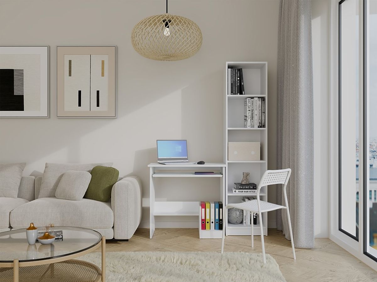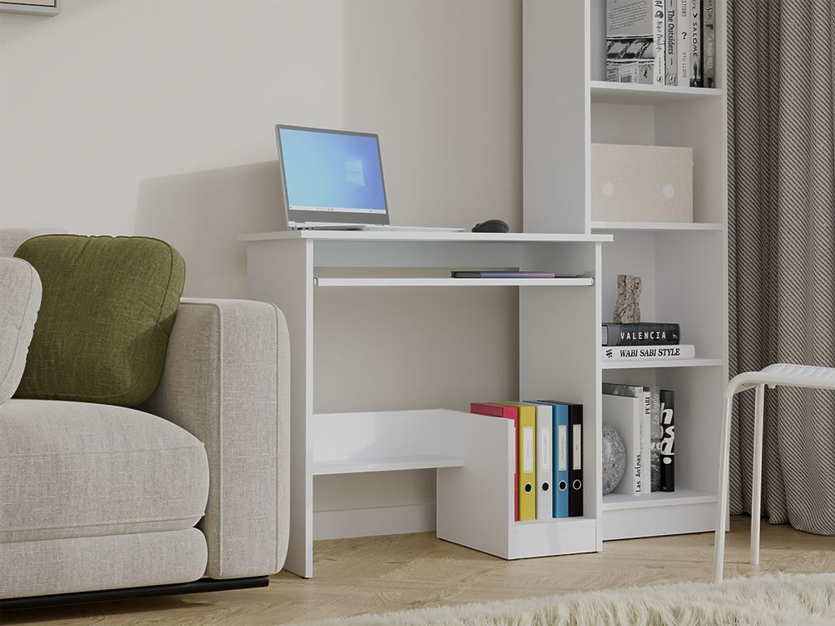 Nábytok je vybavený praktickými riešeniami, ktoré zvyšujú komfort práce: pohodlná vysúvacia polica na klávesnicu, miesto pre centrálnu jednotku počítača alebo šanóny a ďalšia dolná polica na ukladanie.