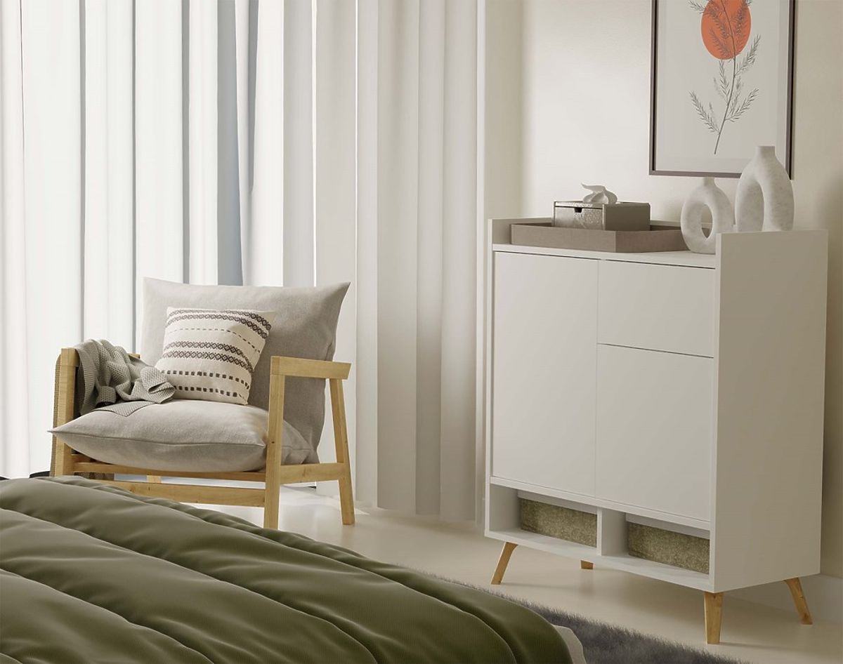 Komoda Colin v bielej farbe je dokonalou kombináciou funkčnosti a modernej estetiky, ideálna pre svetlé a priestranné interiéry.