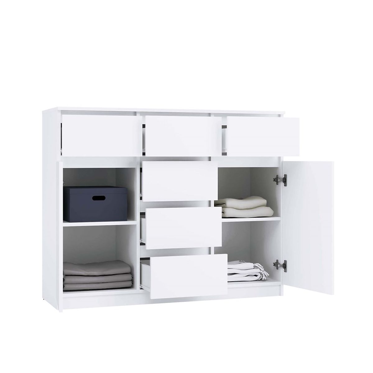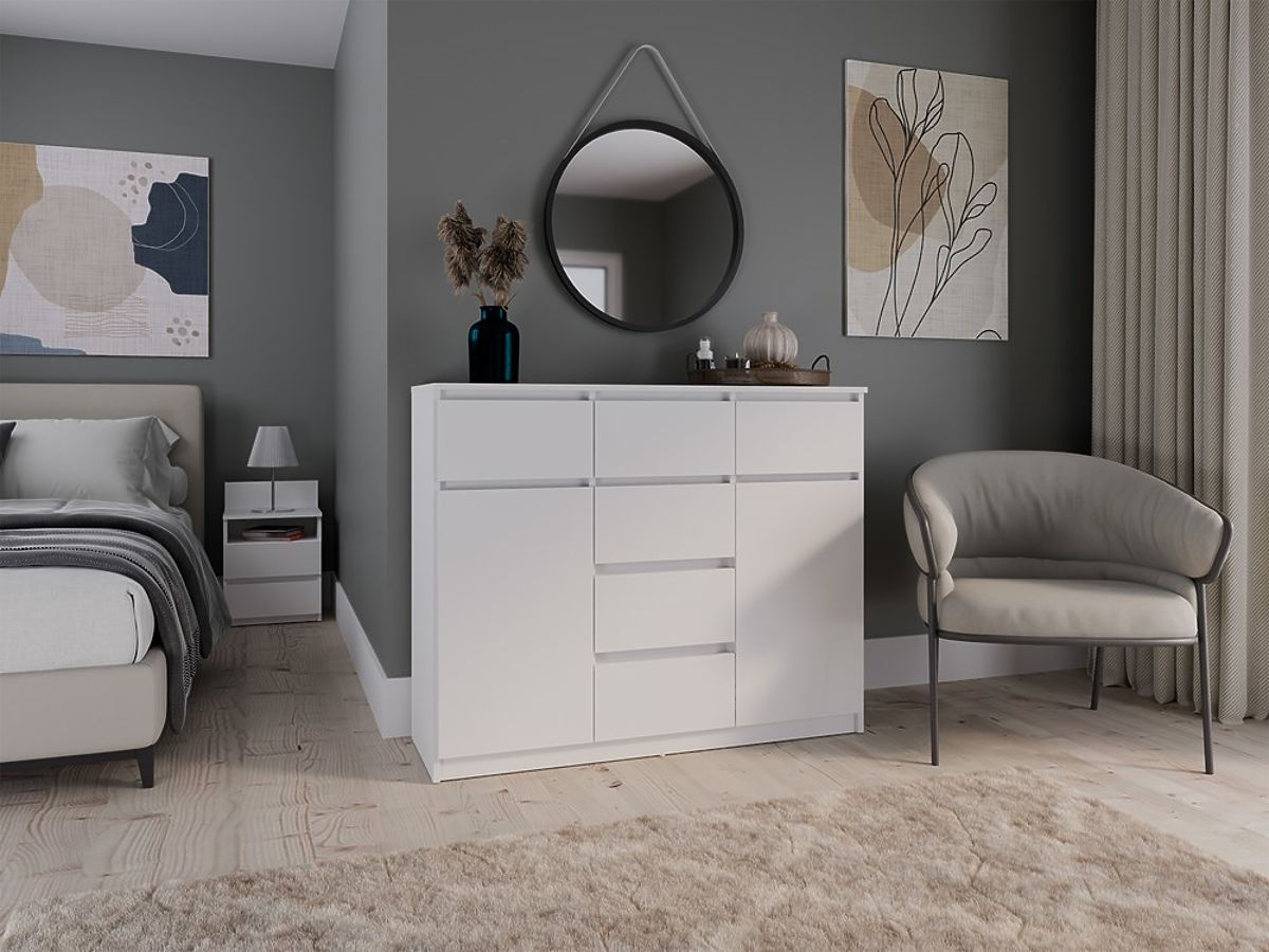 • Priestrannosť a funkčnosť: Komoda je vybavená 2 dverami a 6 priestrannými zásuvkami, ktoré pomôžu s organizáciou vášho priestoru. Ideálna do spálne, obývacej izby, detskej izby alebo predsiene – všade tam, kde potrebujete ďalší úložný priestor.