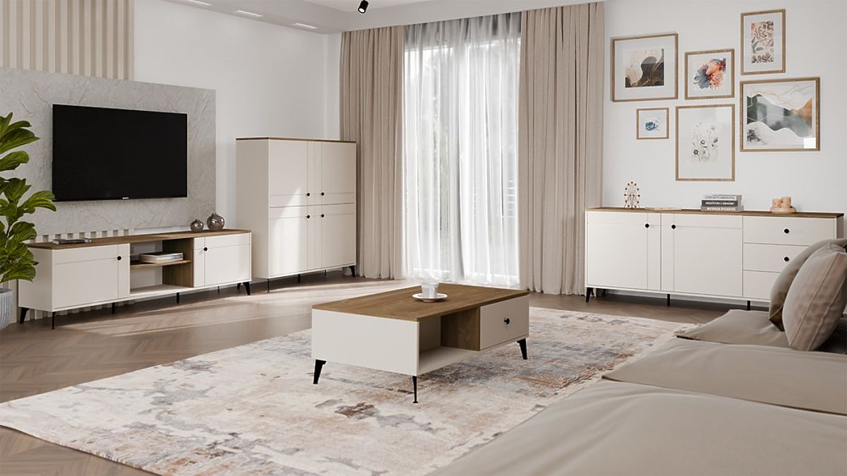 Komoda POINT 2D3S z modernej kolekcie Point kombinuje eleganciu s funkčnosťou. Dokončená v módnej farbe kašmíru s kontrastnou doskou v dekore Dub Castello, perfektne zapadne do moderných, škandinávskych a klasických interiérov.