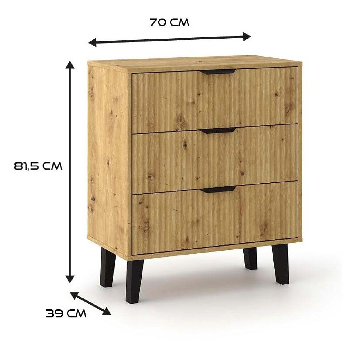 Komoda SCANDI 3S SLIM je ideálnou voľbou pre tých, ktorí hľadajú praktický úložný nábytok s nádychom moderného dizajnu. Teplý odtieň Dubu Artisan v kombinácii s drážkovanými čelami a vysokými čiernymi nohami dodáva interiéru útulnosť a zároveň eleganciu.