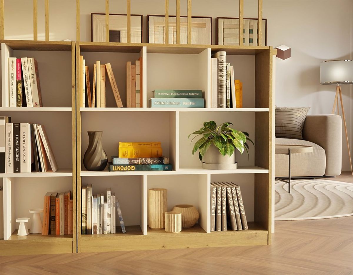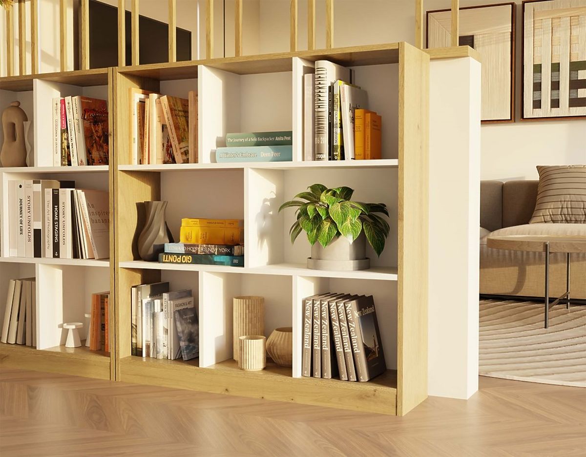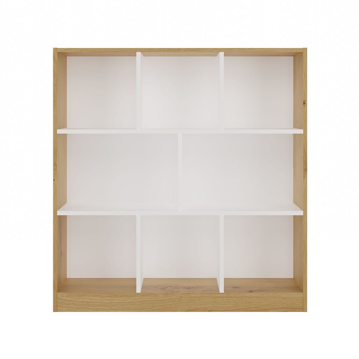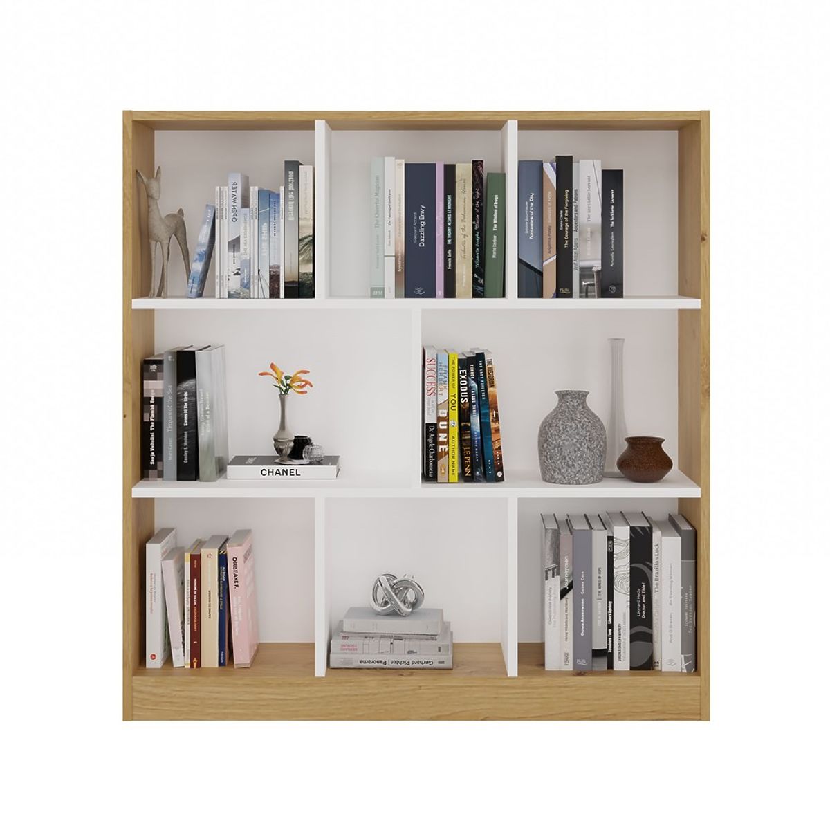 Má 8 priestranných priehradiek, ktoré pomôžu v organizácii priestoru a umožnia estetické vystavenie obľúbených predmetov. Spojenie teplého odtieňa dubu artisan s kontrastnými bielymi poličkami dodáva nábytku moderný a elegantný charakter.