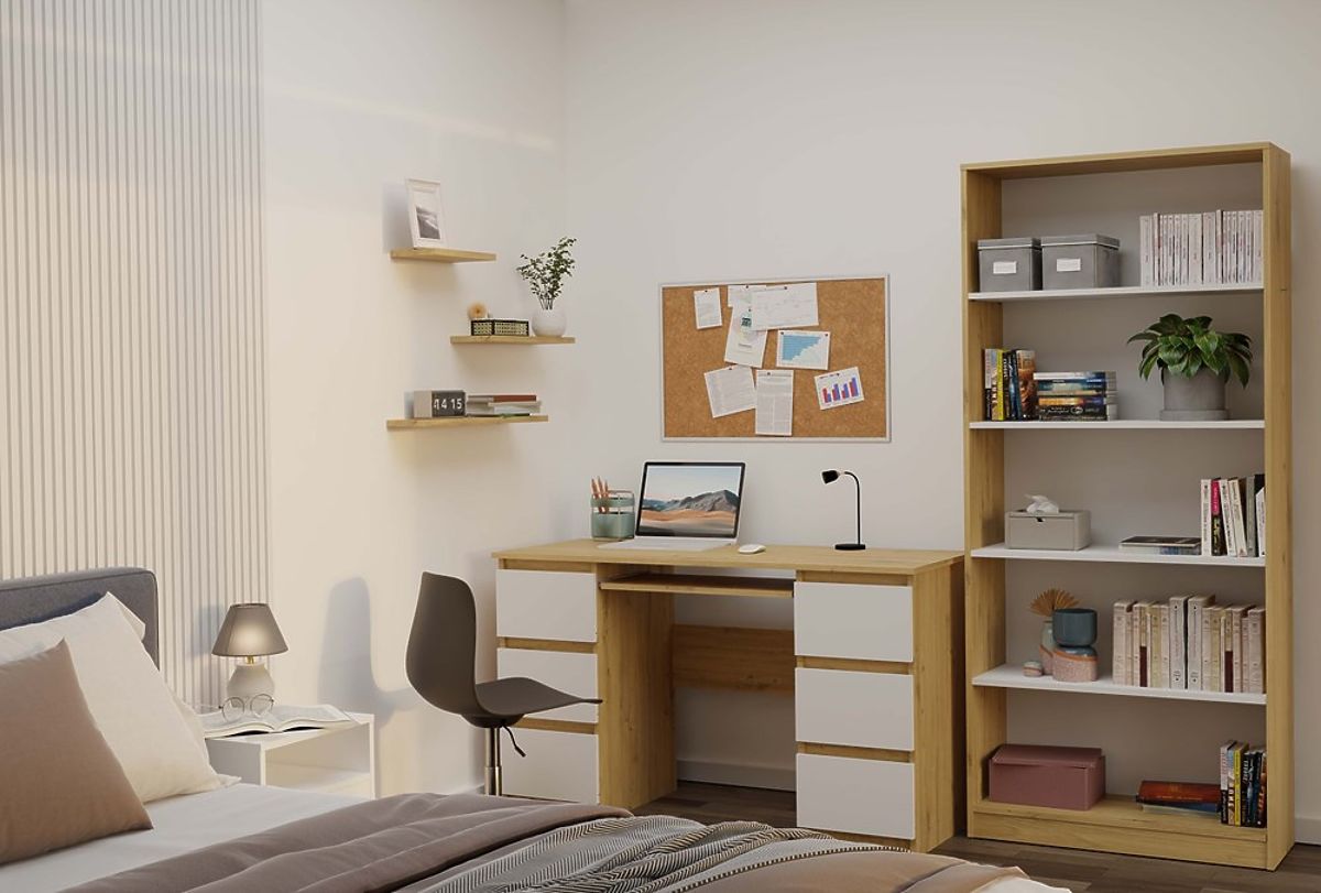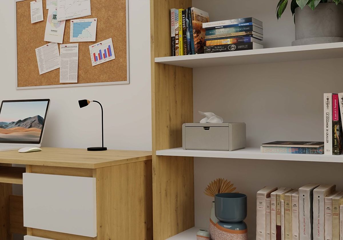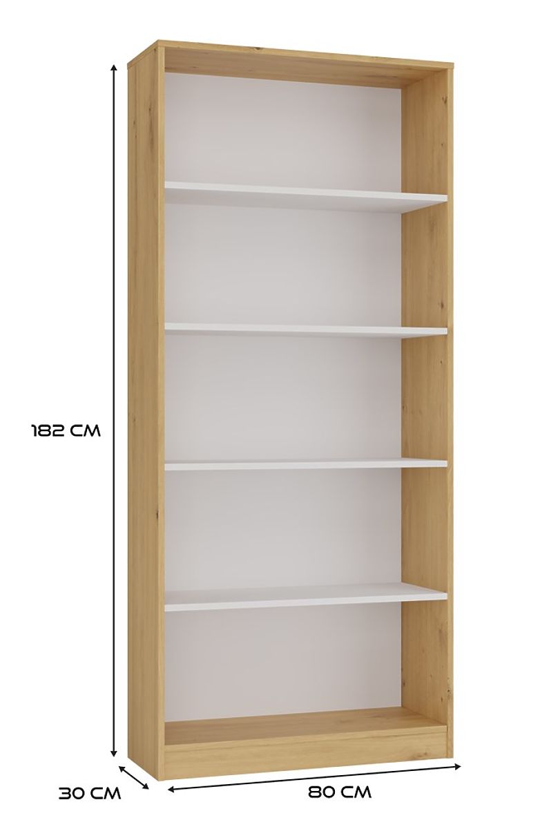Regál R80 je štýlové a praktické riešenie pre ukladanie kníh, šanónov, dekorácií a kancelárskych materiálov. Spojenie teplého odtieňa dubu artisan s kontrastnými bielymi policami dodáva nábytku moderný a elegantný charakter. Skvele sa hodí ako do kancelárie, obývacej izby, detskej izby, tak aj do domácej knižnice.
