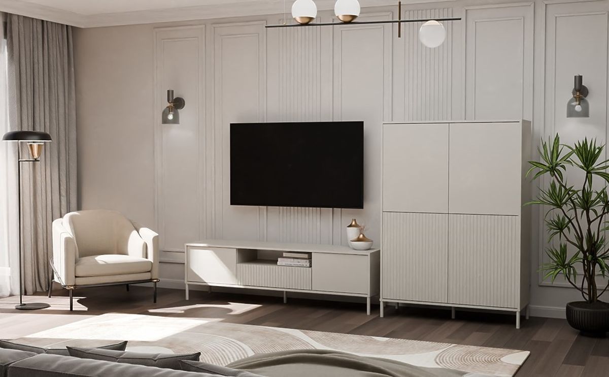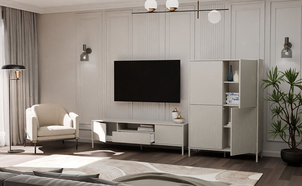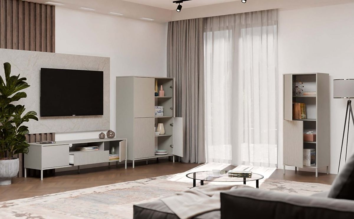 Povrchová úprava nábytku v modernej farbe Kašmír (elegantný odtieň béžovej) dodáva interiéru eleganciu a súčasný charakter, pričom si zachováva neutralitu, ktorá sa ľahko hodí do rôznych dekoratívnych štýlov