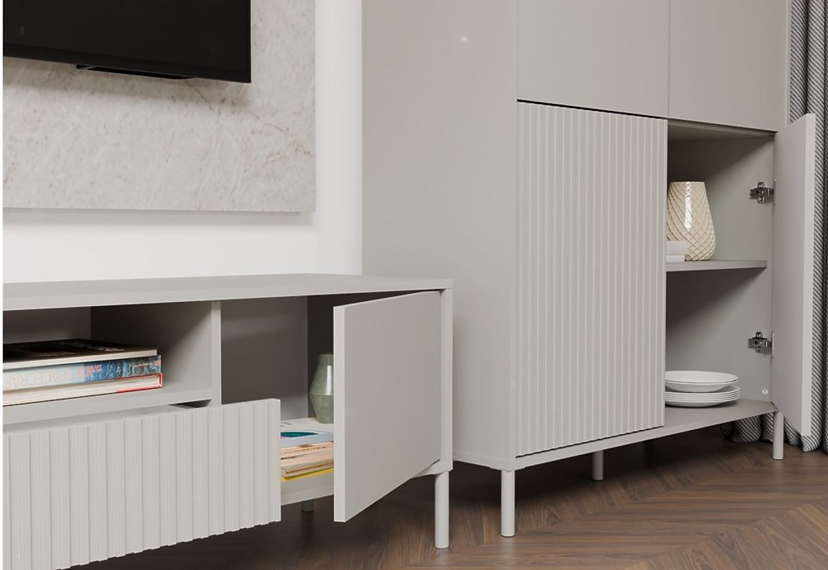 Individuálna konfigurácia dverí – každé zo štyroch dverí je možné ľubovoľne namontovať, čo umožňuje výber, ktoré predné časti budú hladké a ktoré ryhované. Vďaka tomu je možné vzhľad vitríny prispôsobiť vlastným preferenciám a štýlu interiéru.