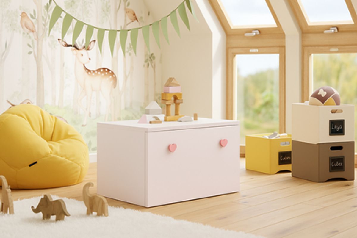 Priestranná truhlica na hračky s moderným dizajnom a ružovou rukoväťou. .. viac
