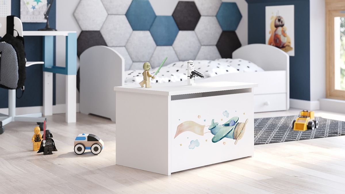 Biela truhlica na hračky s motívom lietadla a UV potlačou. .. viac