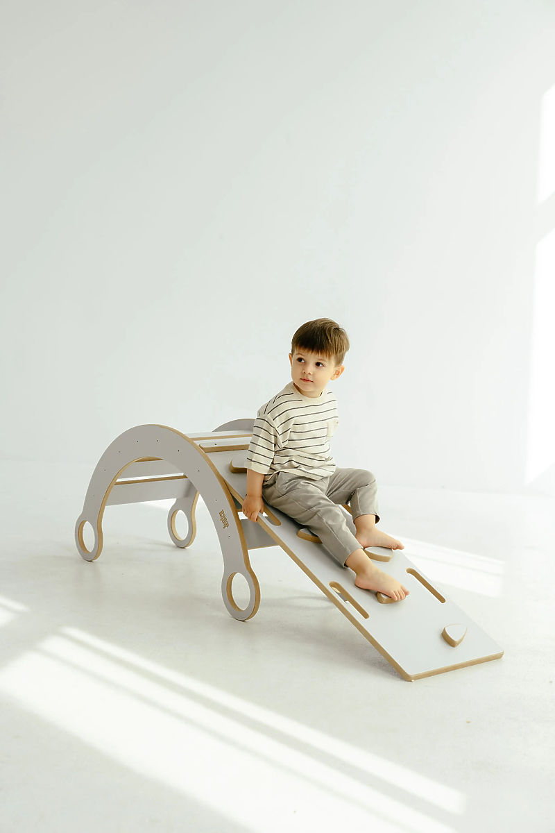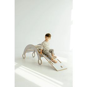 Drevená Montessori hojdačka s bielou šmykľavkou a lezeckou stenou. .. viac