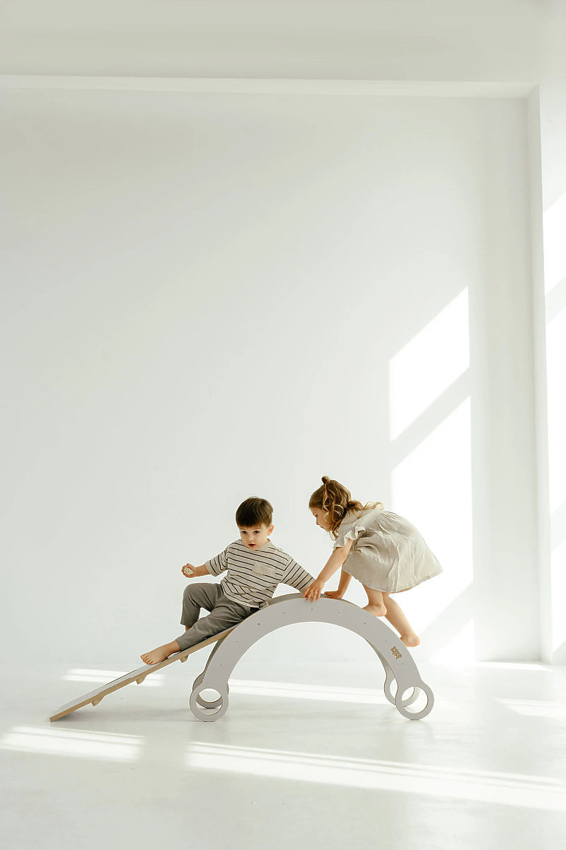 Štýlová drevená Montessori hojdačka so šmykľavkou a lezeckou stenou v bielej farbe sa skvele hodí do každej detskej herne. Táto hojdačka nielenže poskytuje zábavné hojdanie, ale tiež ponúka možnosť lezenia a šmýkania po šmykľavke, čo rozvíja motorické zručnosti, rovnováhu a silu detí.