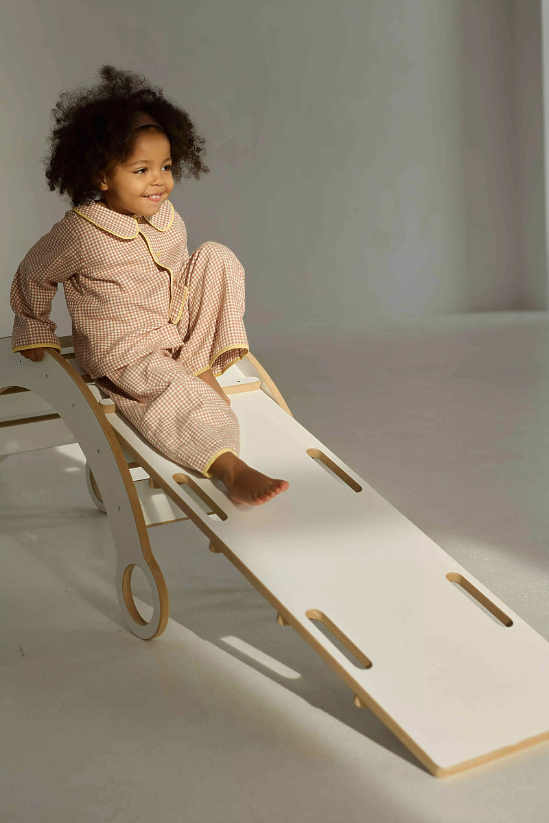 Štýlová drevená Montessori hojdačka so šmykľavkou a rebríkom v prírodnej farbe sa skvele hodí do každej detskej herne alebo izbičky. Tento multifunkčný set poskytuje nielen zábavné hojdanie, ale aj možnosť lezenia po rebríku a šmýkania po šmykľavke, čím prirodzene podporuje rozvoj motorických zručností, rovnováhy a sily detí.