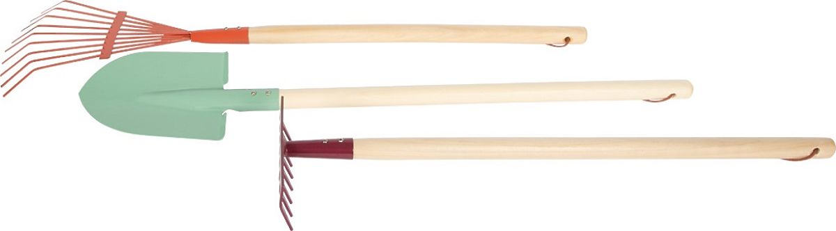 Rozmery: rýľ cca 12x2,5x71 cm, hrable cca 15x6,5x60 cm, hrable na lístie cca 20x2,5x73 cm, kanvička 2v1 18x9,5x23 cm