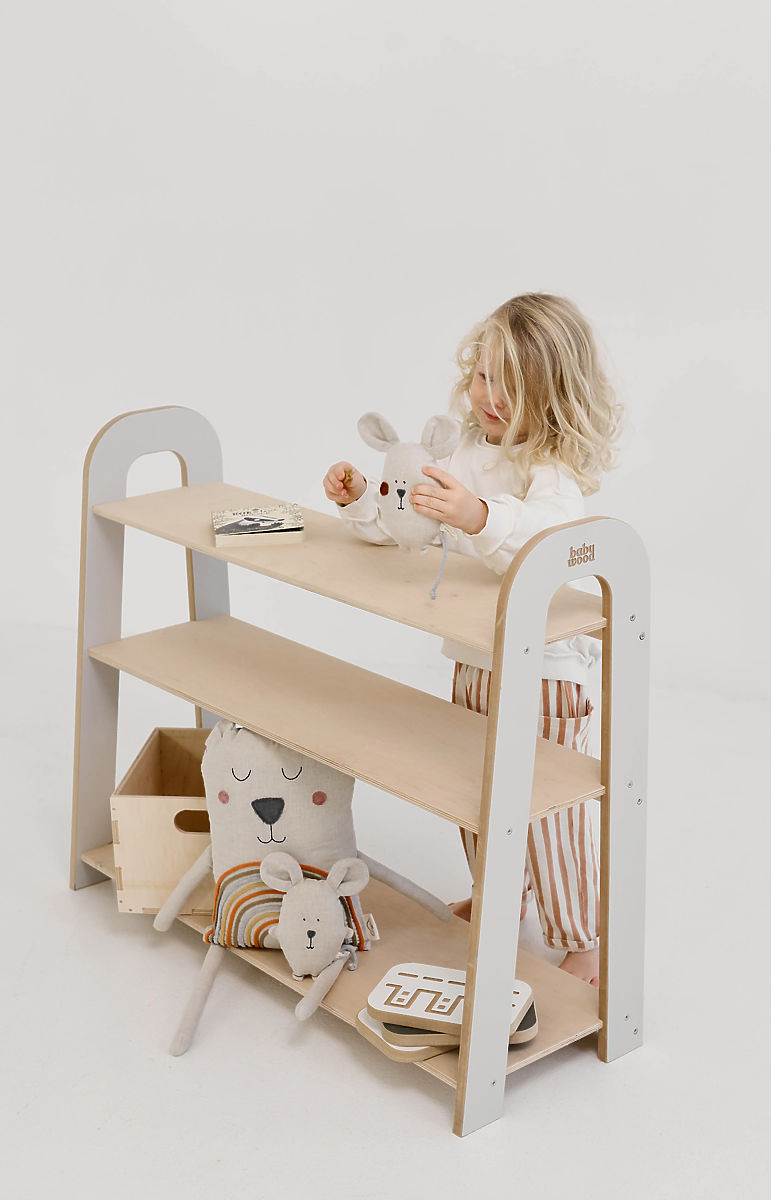 Otvorený regál SLIM L je praktickým a zároveň estetickým riešením nielen pre ukladanie kníh, ale aj pre dotvorenie útulnej atmosféry detskej izby. Je navrhnutý s ohľadom na potreby malých čitateľov a prirodzene ich motivuje k čítaniu, objavovaniu príbehov a samostatnému udržiavaniu poriadku. Vďaka otvorenému prevedeniu môžu deti knihy ľahko vyberať, prehľadne ich vystavovať a ukladať späť na svoje miesto. Tri široké police umožňujú uloženie kníh rôznych formátov a veľkostí. Výška regálu je prispôsobená deťom, takže ho môžu pohodlne používať bez pomoci dospelých. Regál zároveň slúži ako jemný dekoratívny prvok, ktorý dodá detskej izbe príjemnú a pokojnú atmosféru.